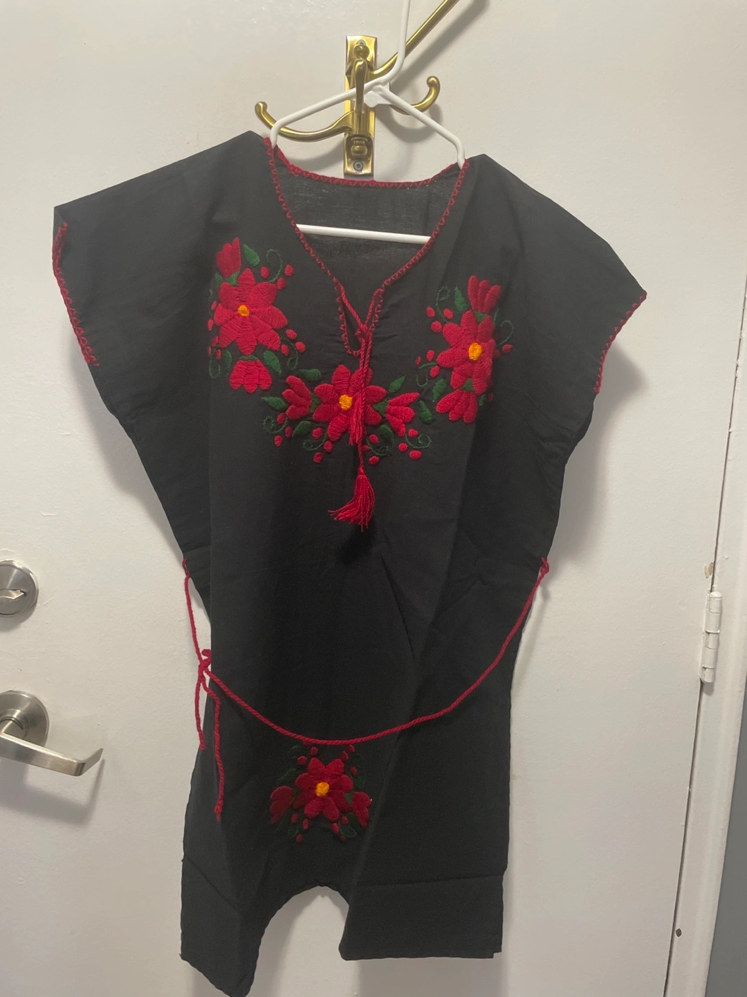 513Beautiful black peasant top. Features intricate red floral embroidery. Short sleeves, V-neckline with drawstring. Comes with a matching waist tie.