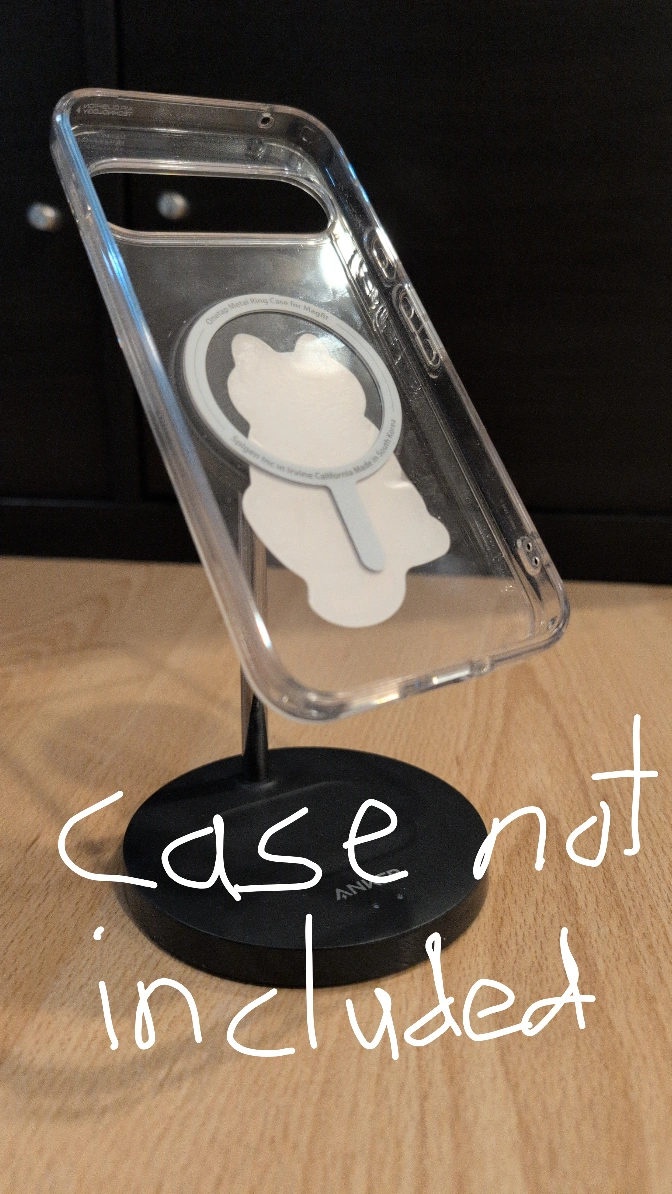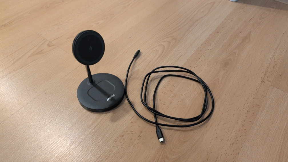 Anker wireless charging stand that can charge your Magsafe iPhone on the circular pad and your Airpods on the base at the same time. The magnets are quite strong and your phone will snap into place and hold there. Comes with 5 foot usb c cable, but no wall brick.