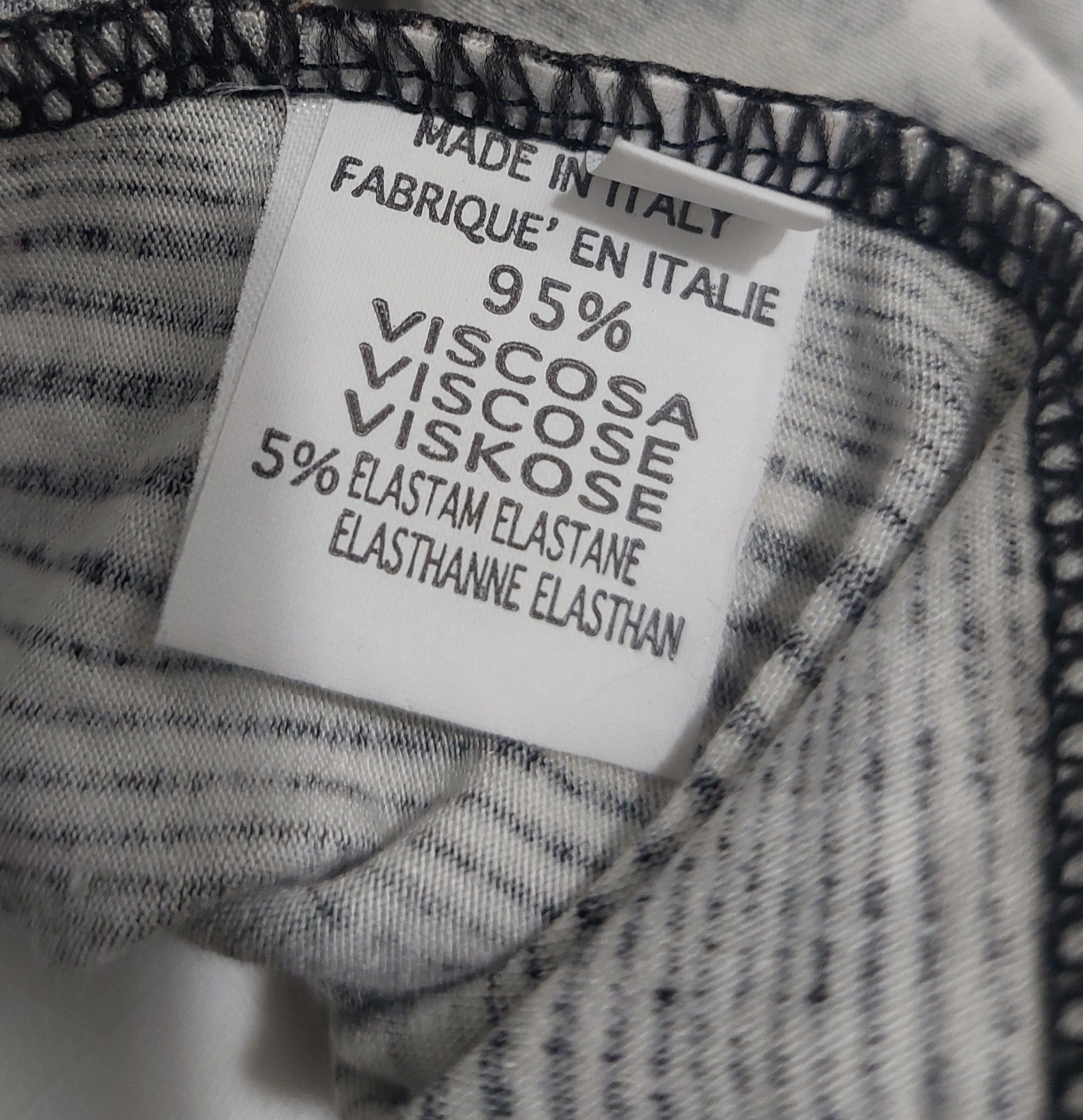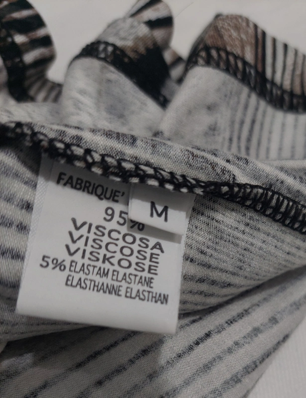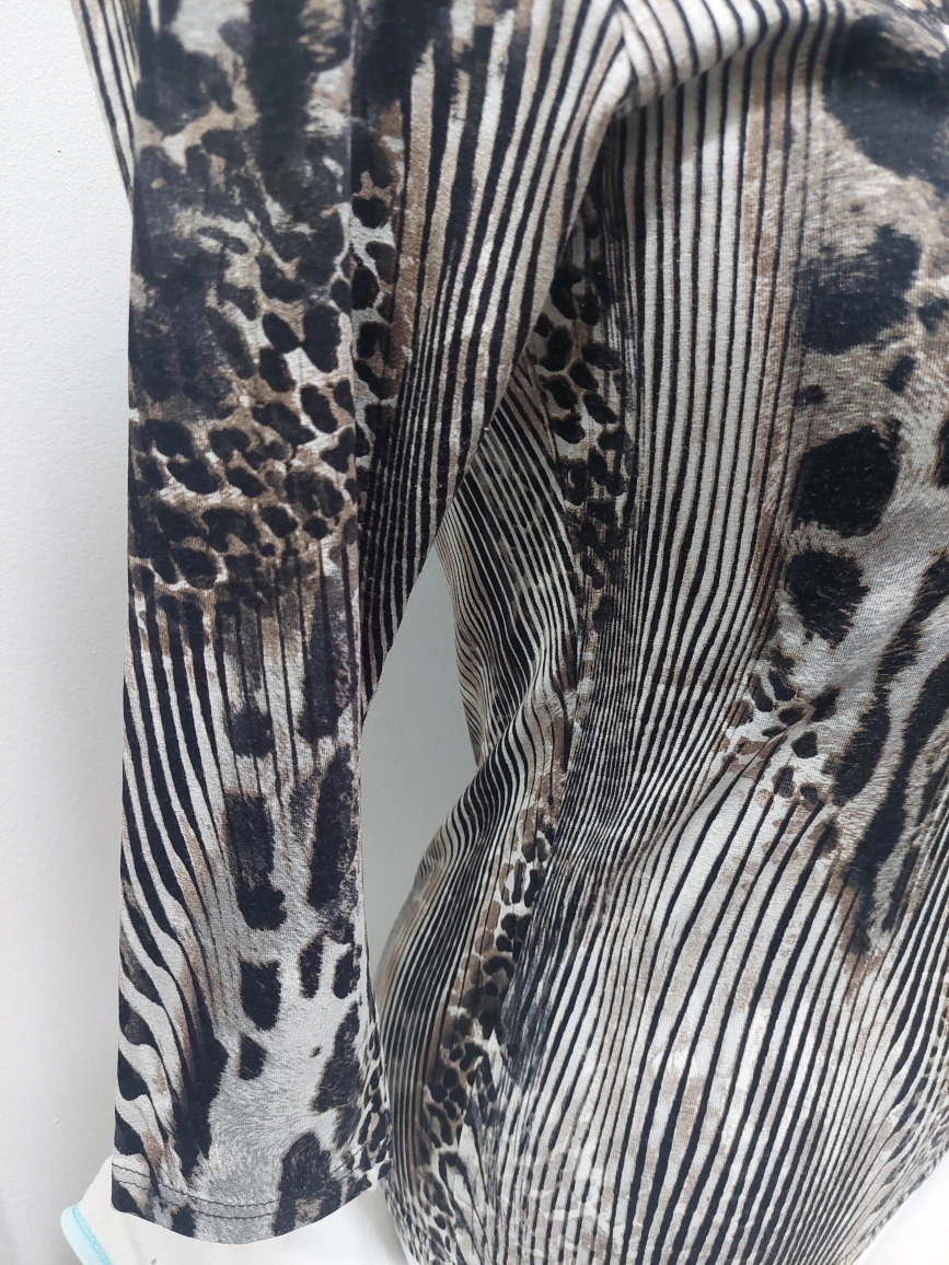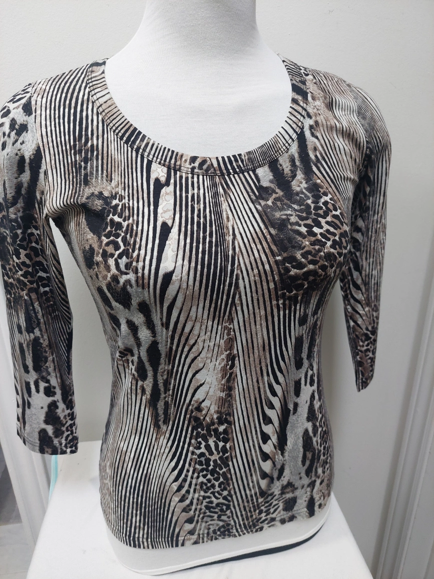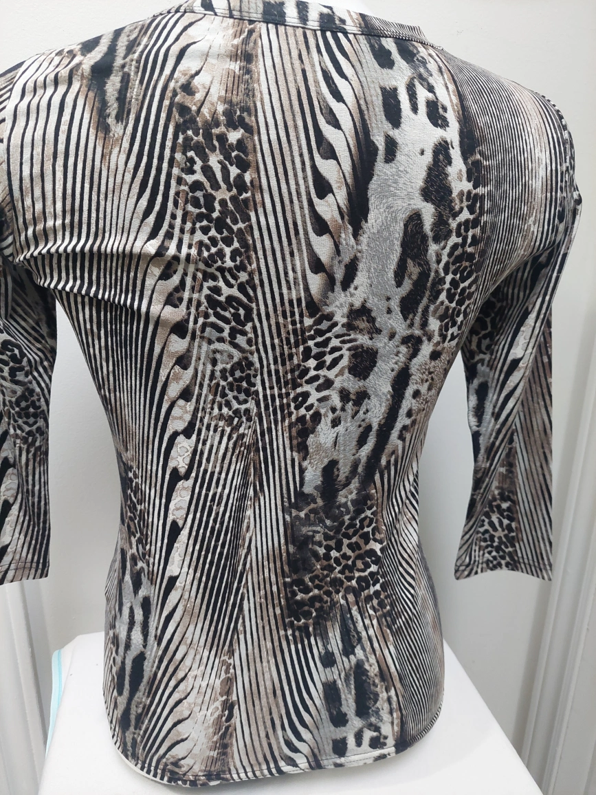 Three-quarter sleeve top. Medium size. Animal print, primarily black, brown, and beige. 95% Viscose, 5% Elastane. Made in Italy.