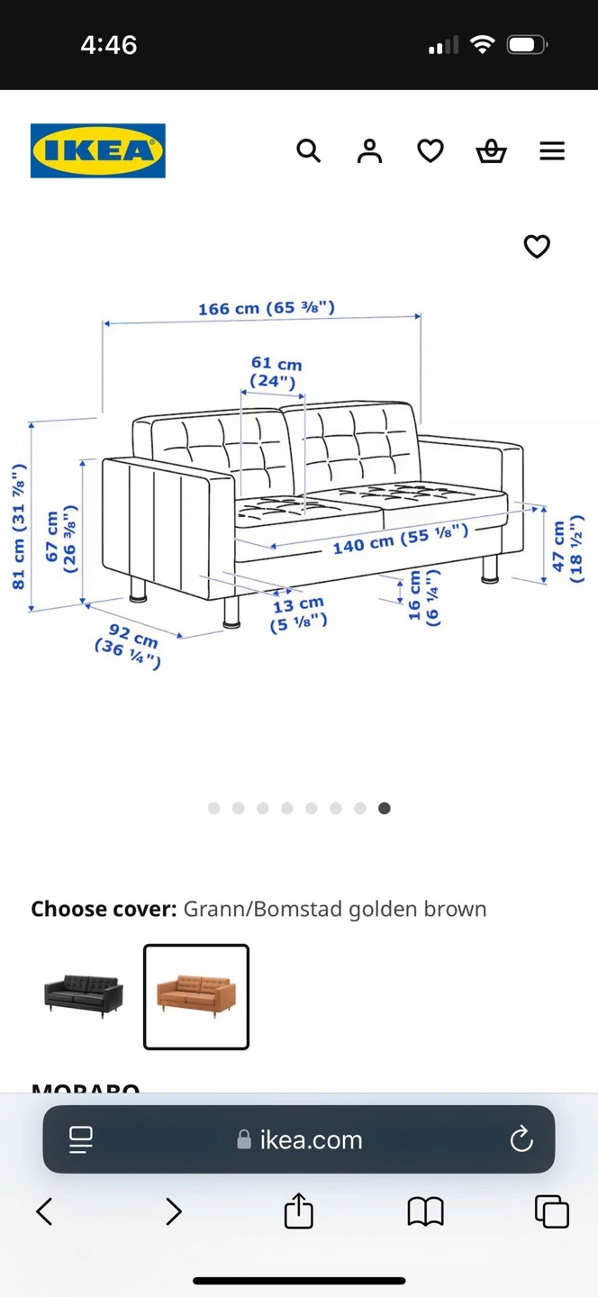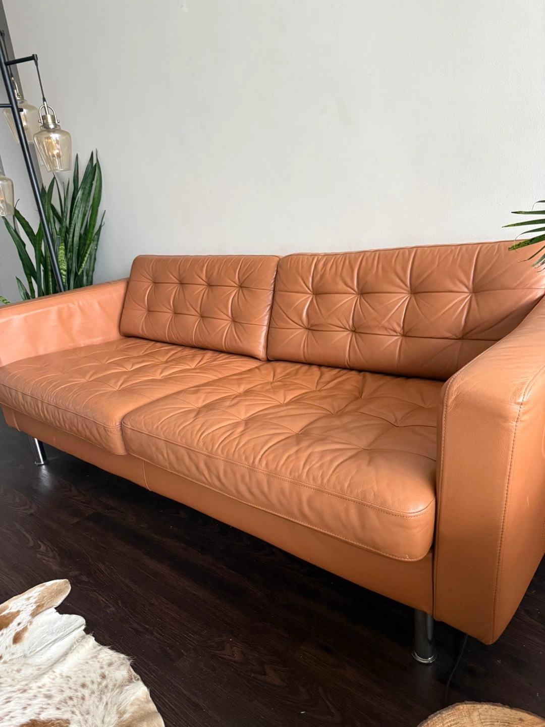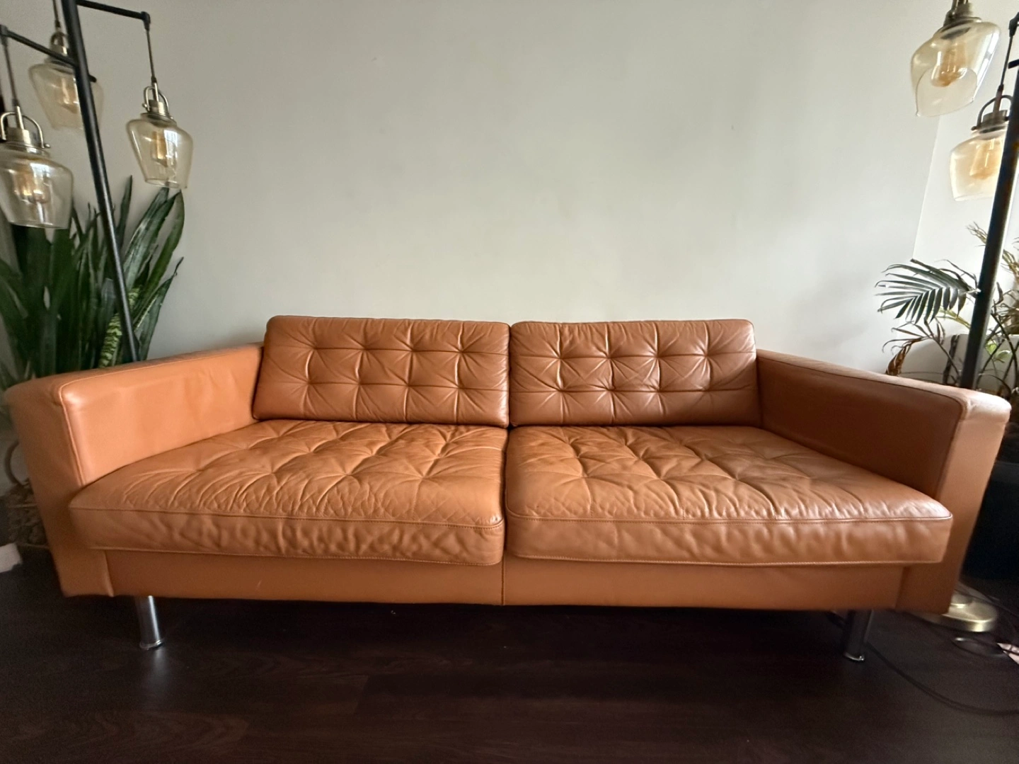 Comfortable two-seater sofa. Golden brown leather upholstery. Metal legs. Like new condition.