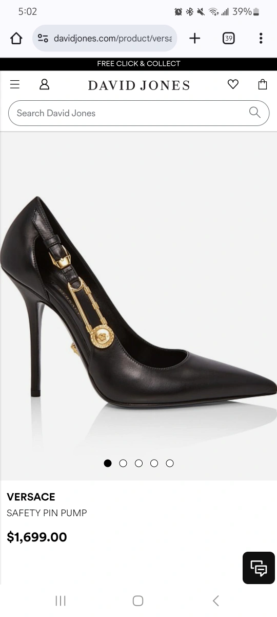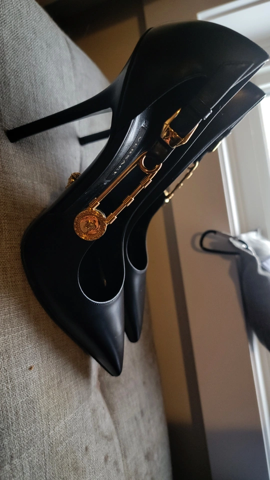 Elegant black leather high heels. Pointed toe, stiletto heel. Gold-toned Medusa accents. Features a safety pin detail.