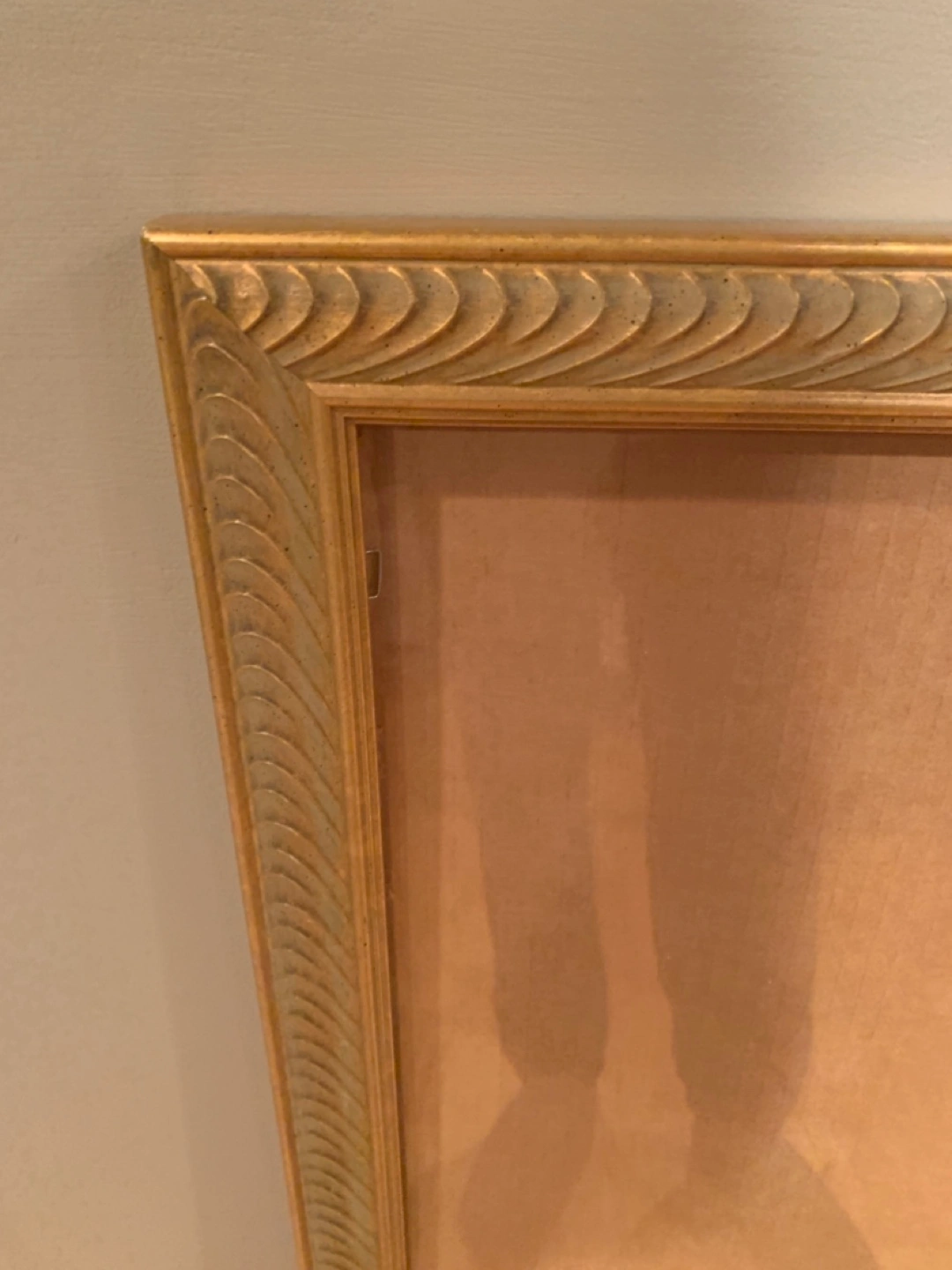 Large, ornate gold picture frame. Ready to display your favourite artwork or photographs. Features a textured, decorative frame. Includes hanging wire.