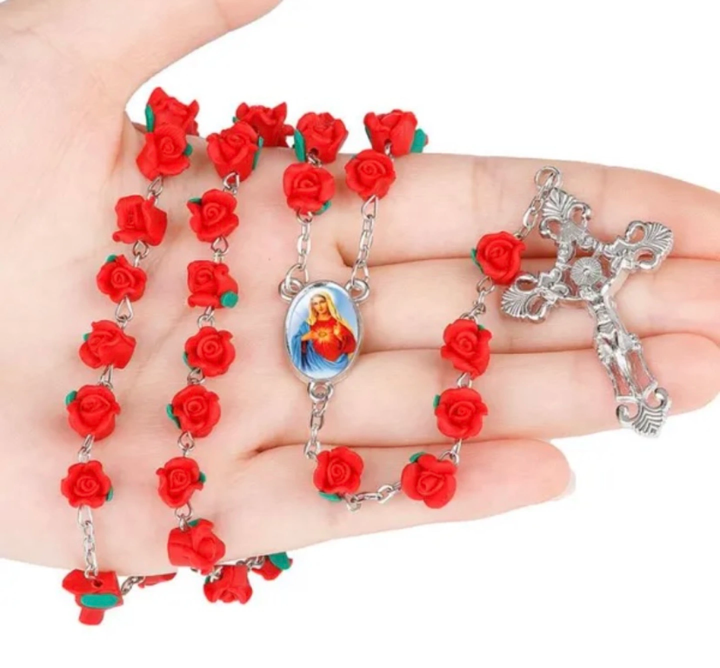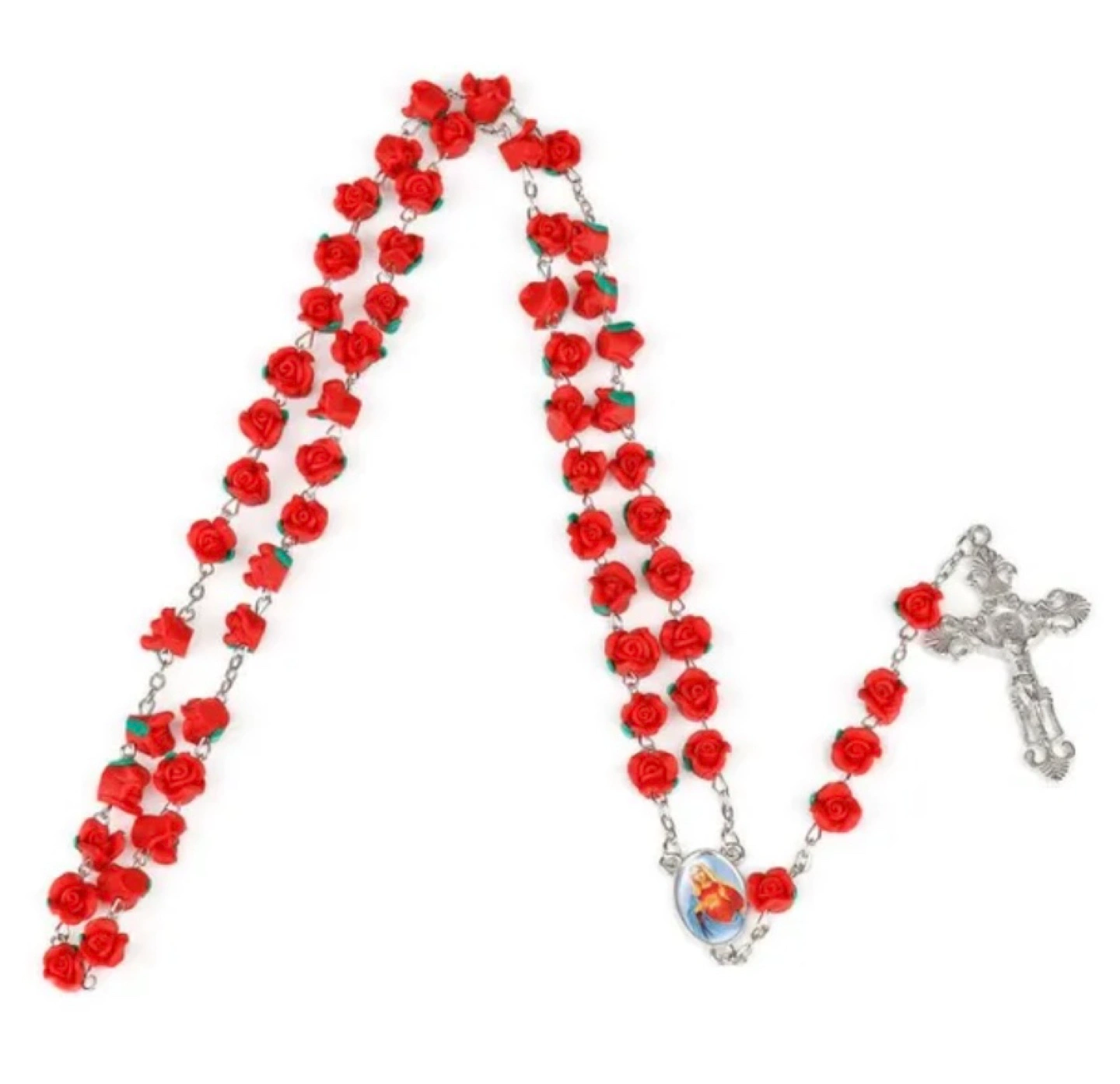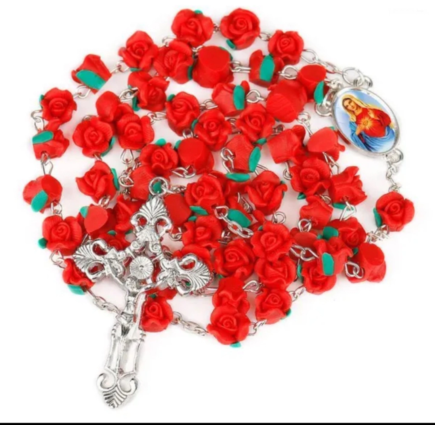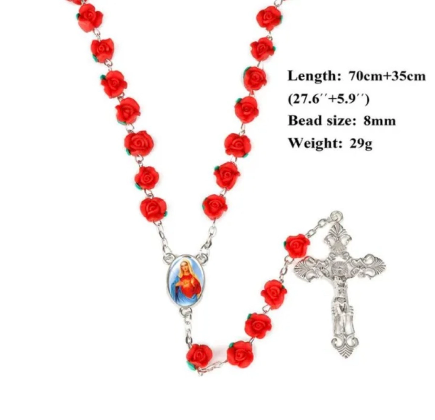 Beautiful red rose rosary beads. Features a silver-toned crucifix and centerpiece. Measures 70cm + 35cm. Bead size: 8mm. Weight: 29g. Perfect for prayer or gifting.