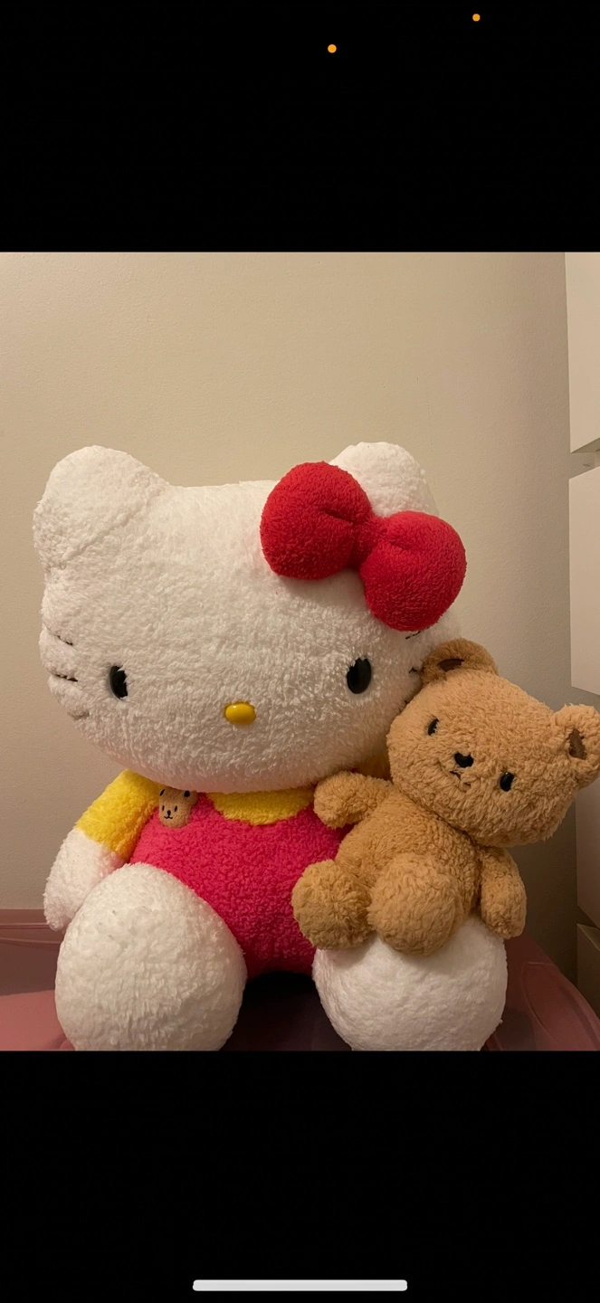 113Large Hello Kitty plush toy. Wearing a pink dress. Includes a smaller brown bear plush. Soft and fluffy.