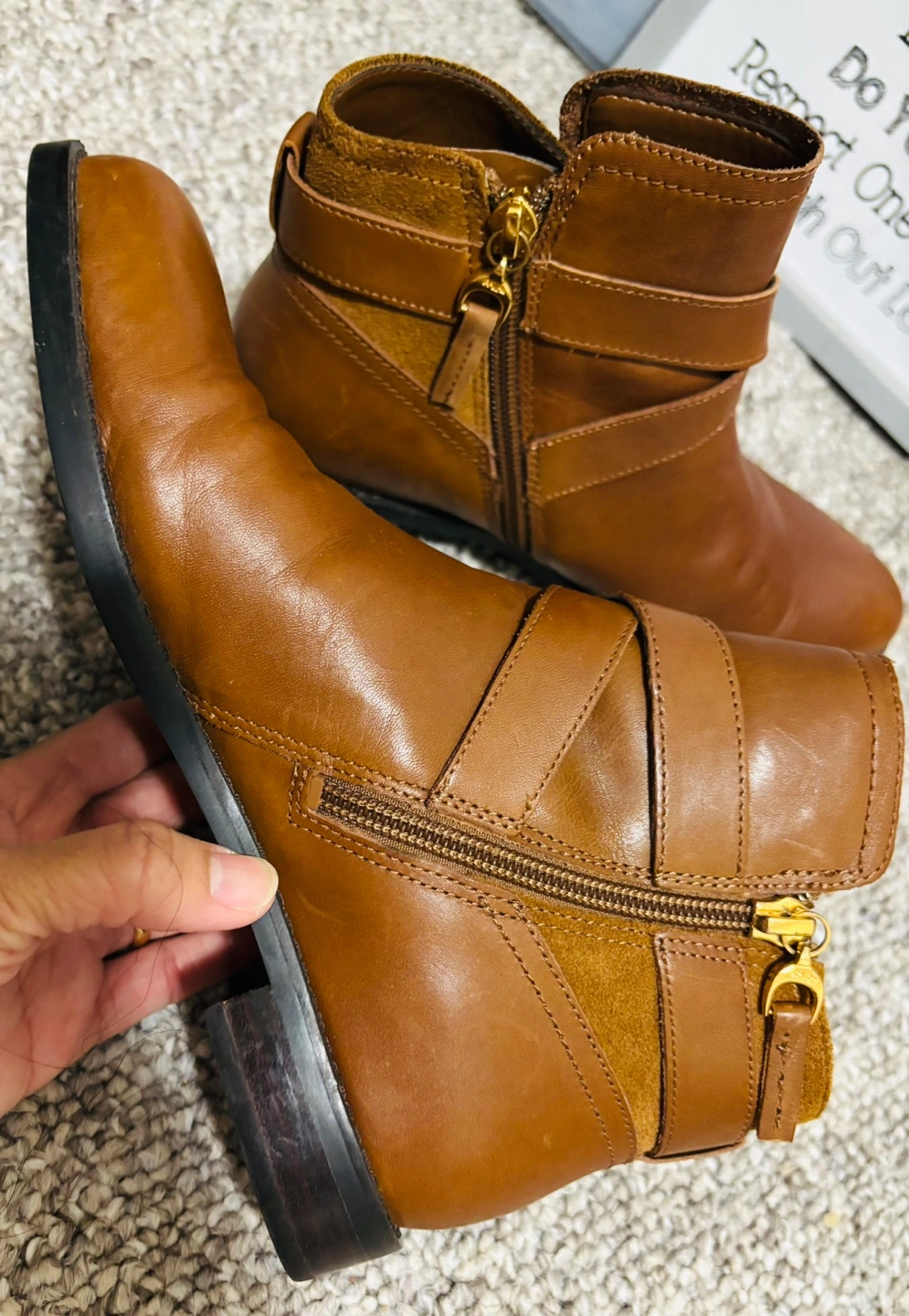 Brown leather ankle boots. Side zipper closure. Suede accents. Flat heel. Size 5.5B.