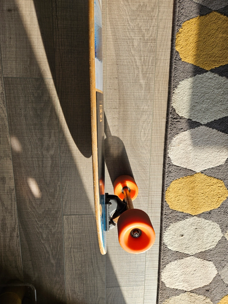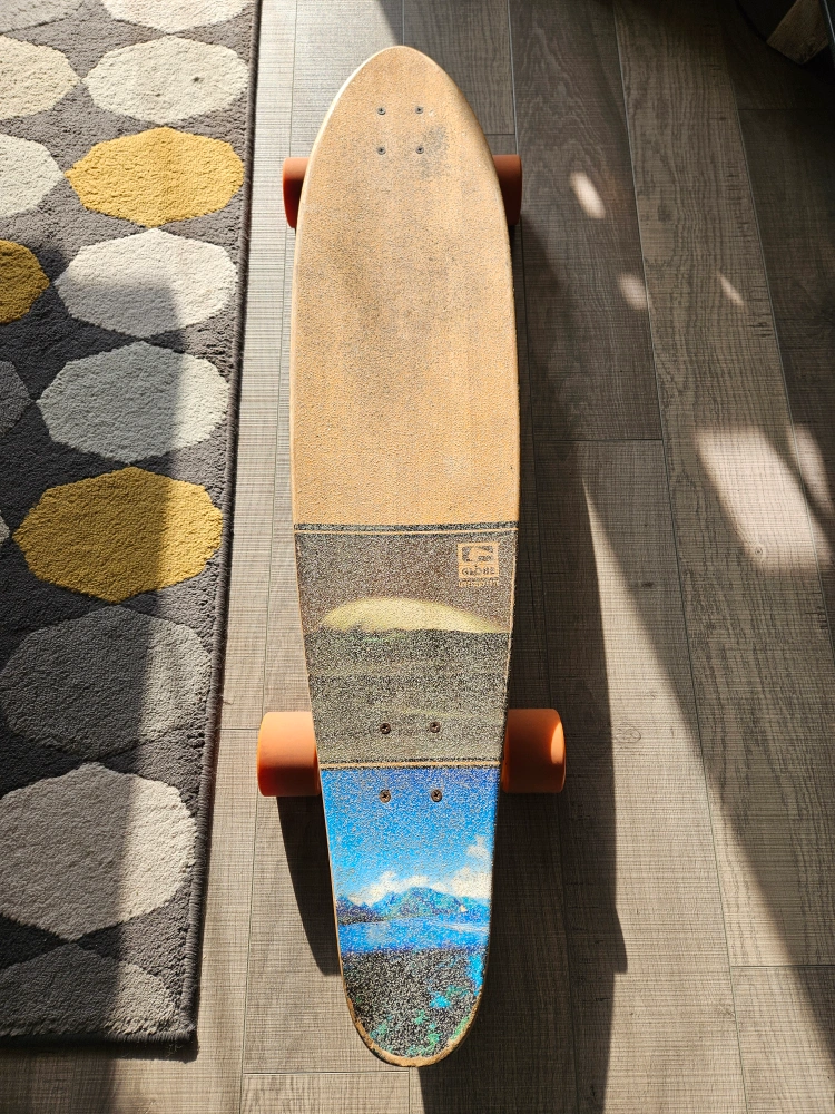 Used Globe "Tunnel Vision" longboard in a very good used condition! Wheels are upgraded to 74mm for a smoother and faster ride. This sharp looking board has been cleaned, tuned and is ready to go cruising with you!