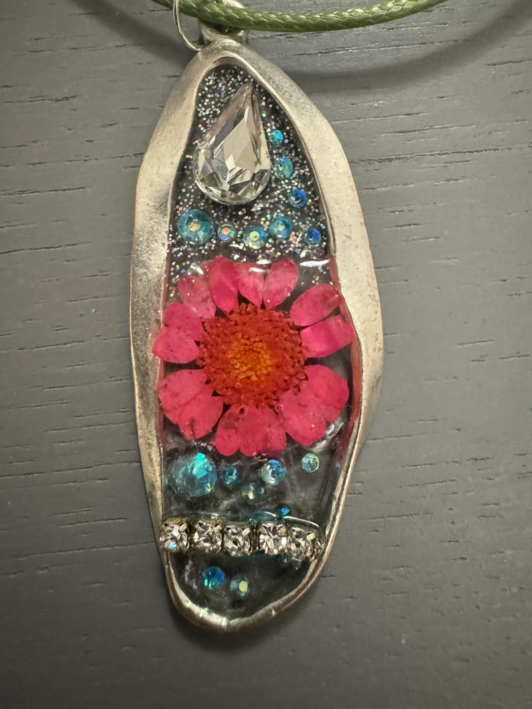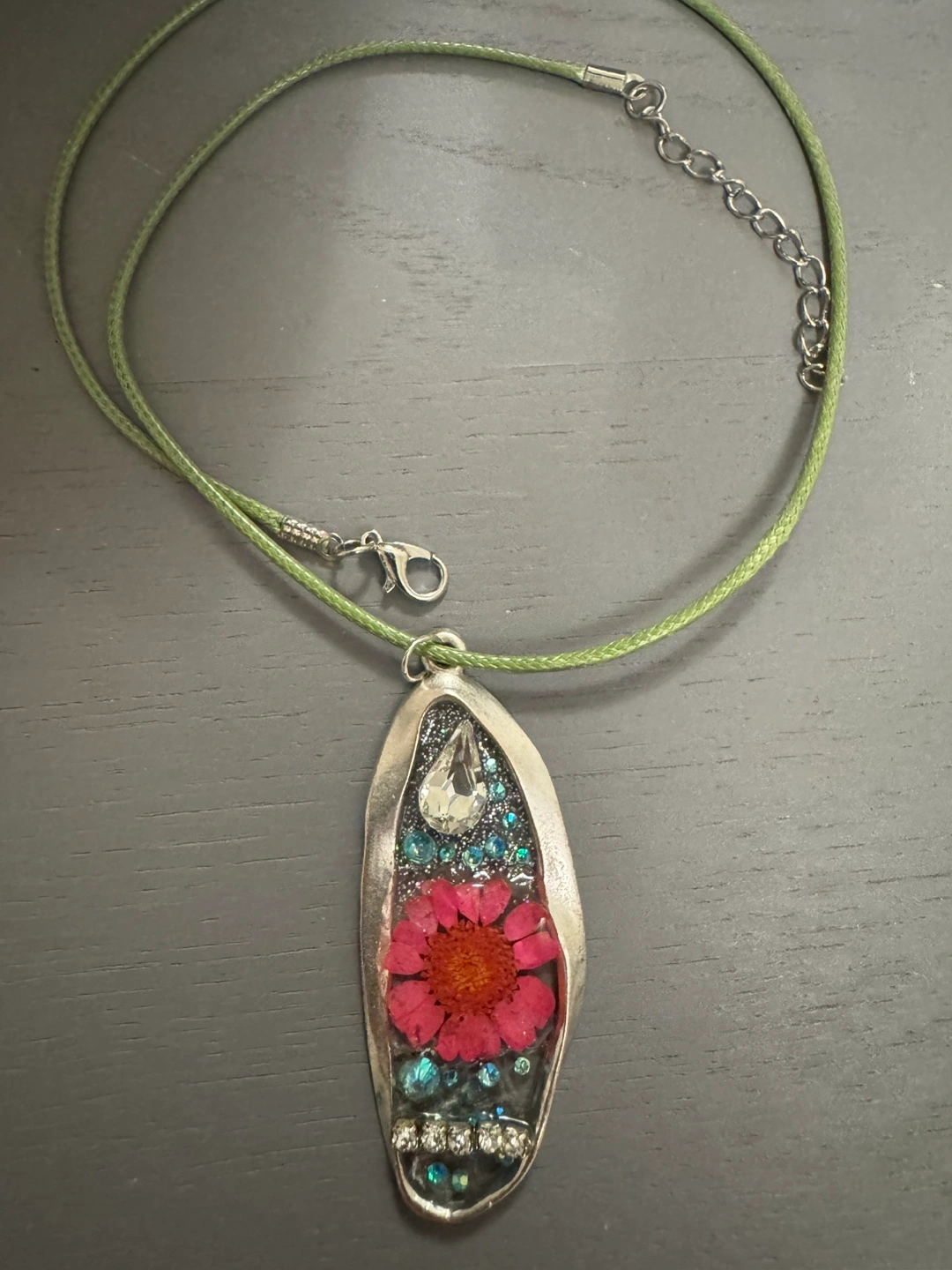 166Beautiful handmade necklace. Features a resin pendant with pressed flower and crystals. Green cord necklace. Silver-toned metal frame. Elegant and eye-catching.