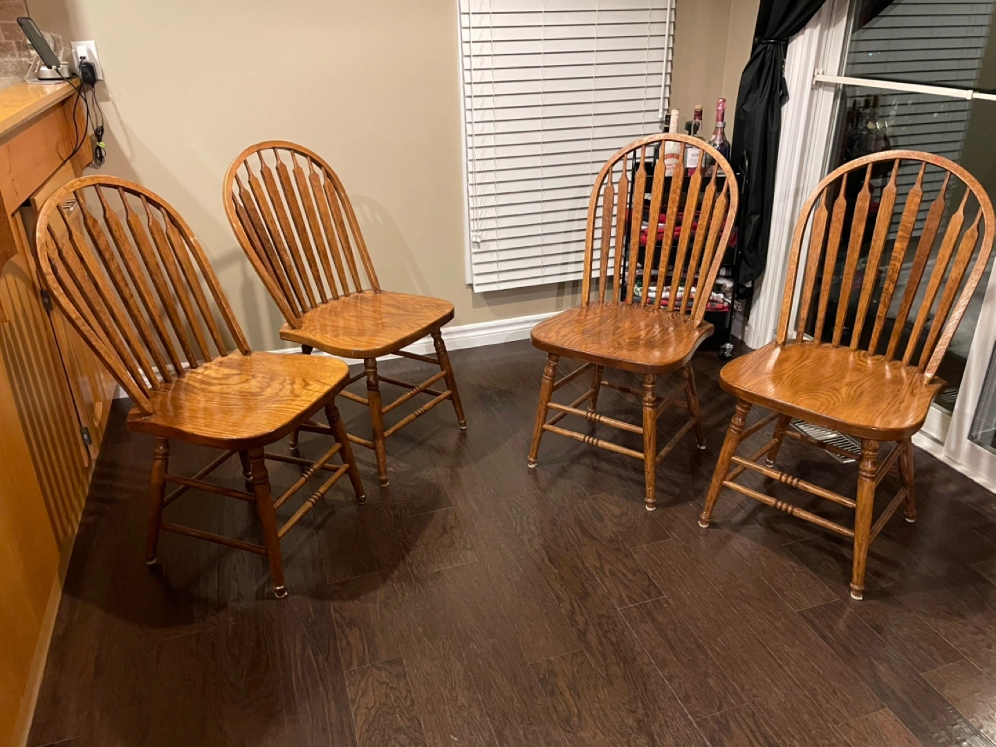 Four solid wood dining chairs. Traditional style. Brown finish. Good condition. Excellent for kitchen or dining room.