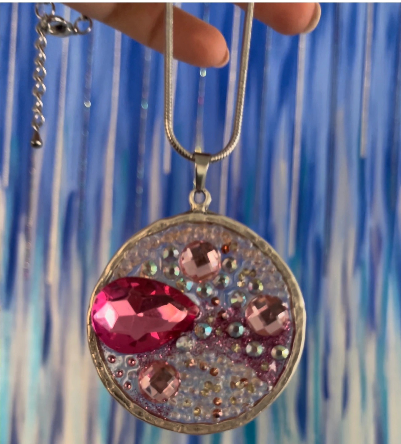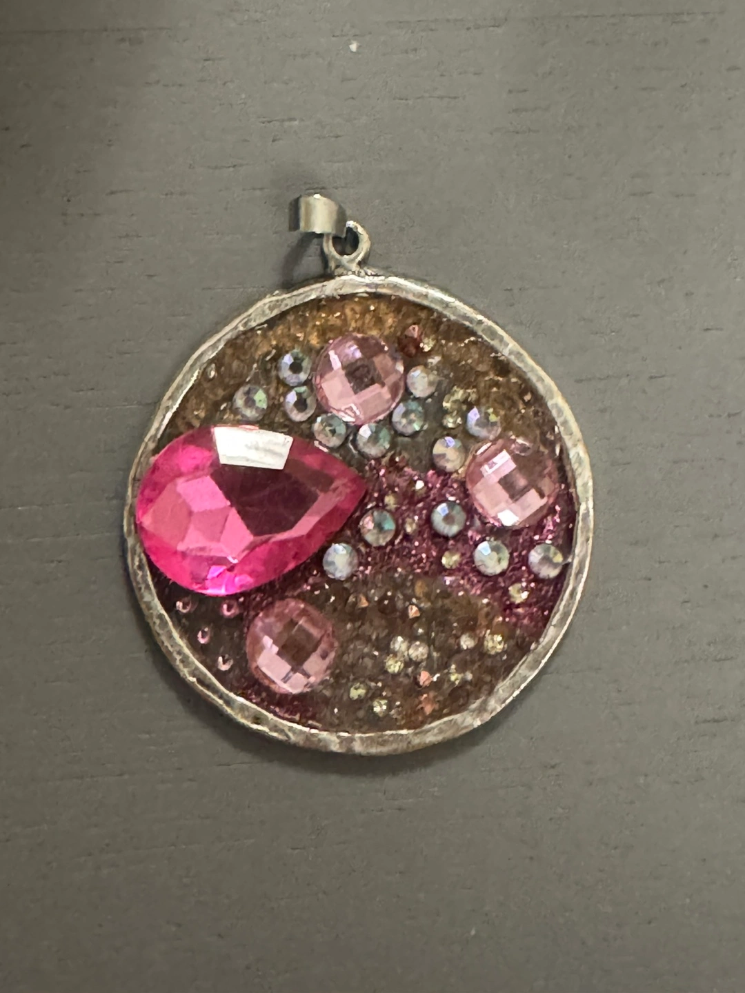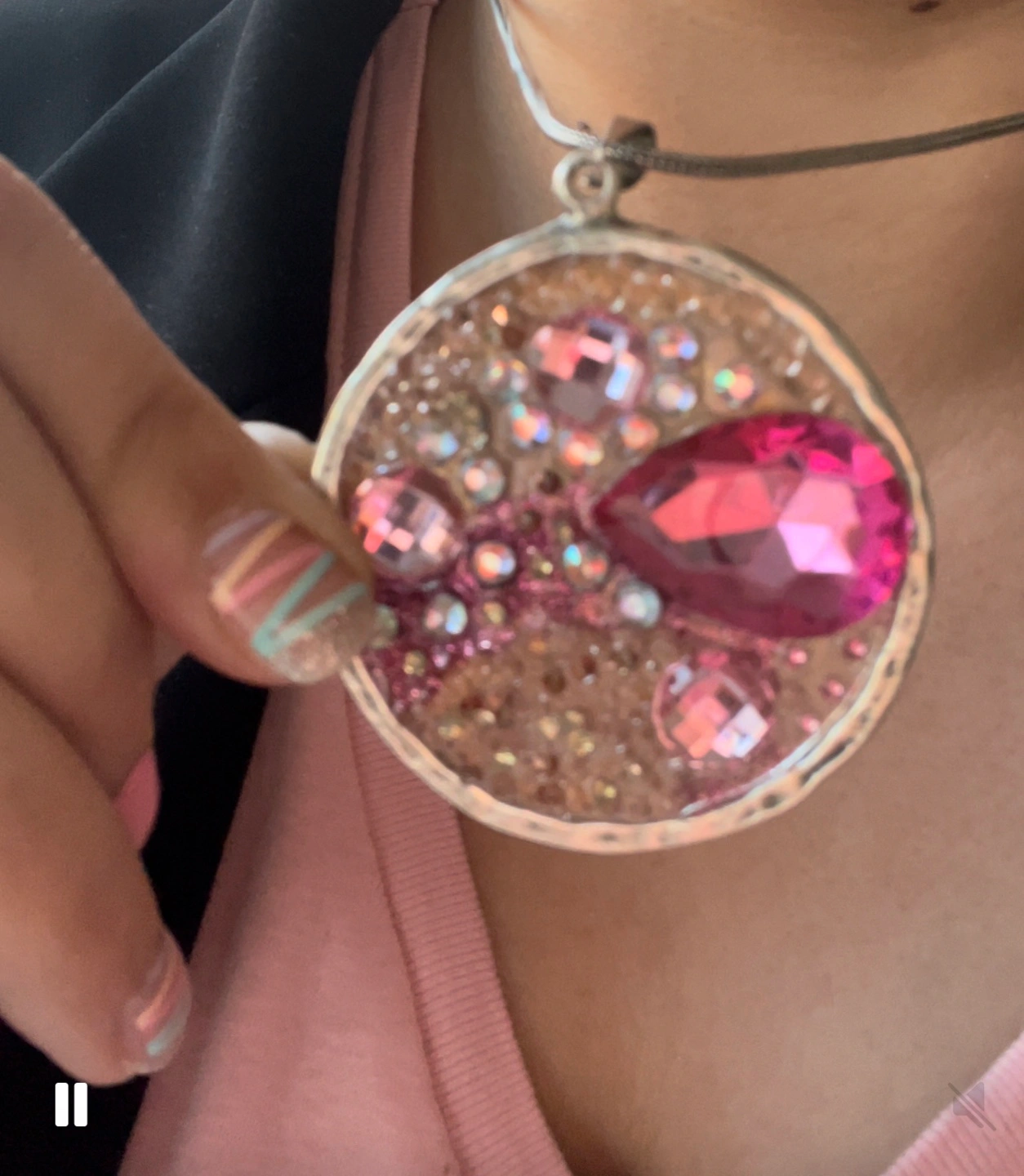 166Gorgeous statement necklace. Features a large round pendant with pink and clear crystals. Eye-catching piece perfect for adding some glamour to any outfit. No chain