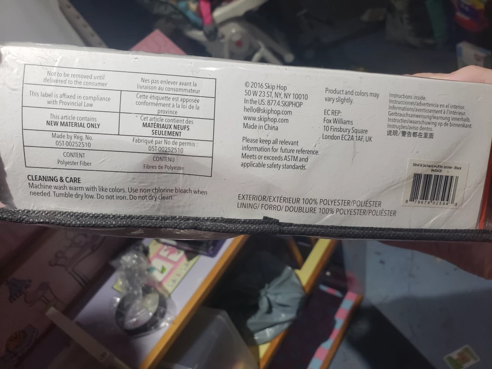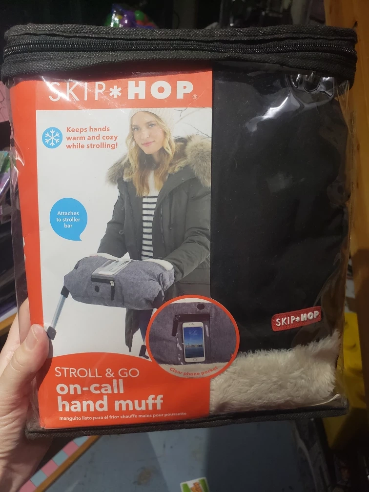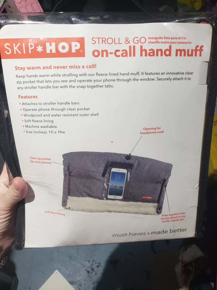 Keeps hands warm while strolling. Features innovative clear zip pocket that lets you operate your phone through the window. Attaches to stroller handle bars. Machine washable.