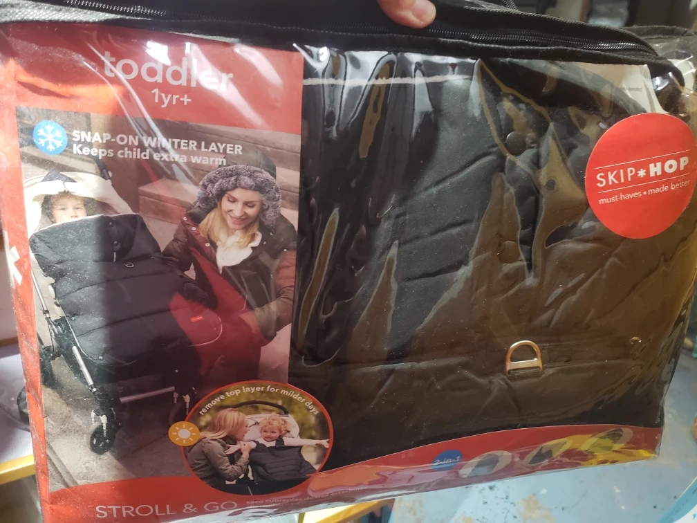 Stroller footmuff for toddlers 1+. Three-season design. Snap-on winter layer for extra warmth. Water-resistant outer shell. Machine washable. Fits most strollers.