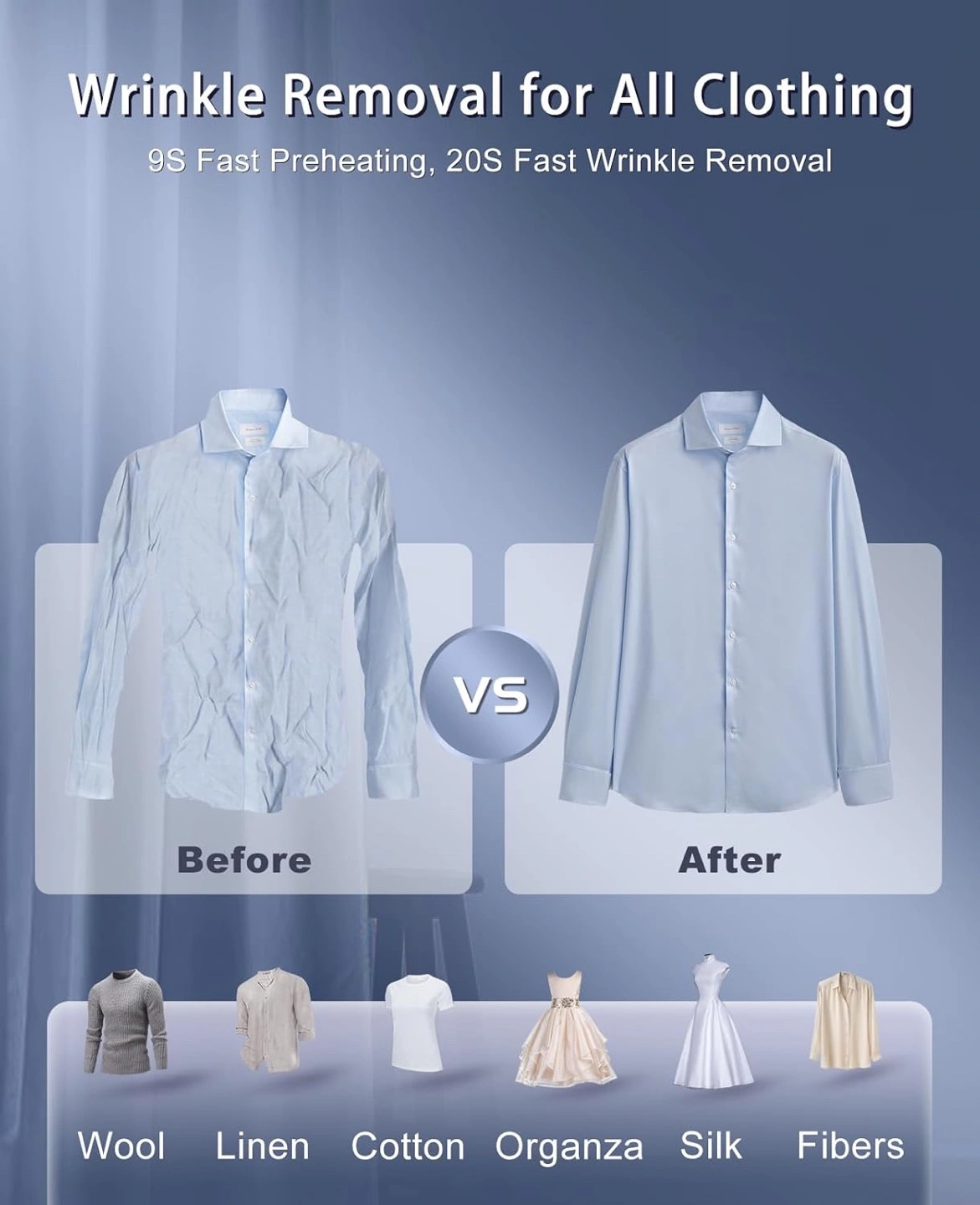 Lightweight and portable handheld garment steamer. Great for home or travel. Features a large water tank and powerful steam output for quick wrinkle removal. Suitable for various fabrics including wool, linen, cotton, silk, and organza. Heats up quickly and provides continuous steam.