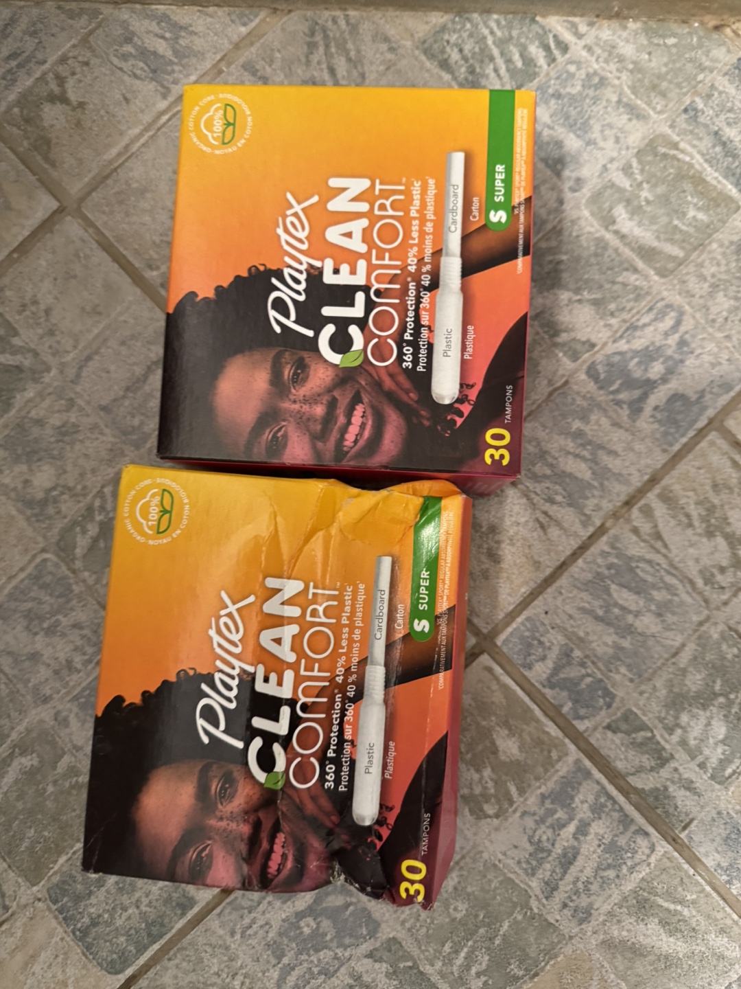 30 count boxes of Playtex Clean Comfort Super tampons. 40% less plastic. New, unopened.