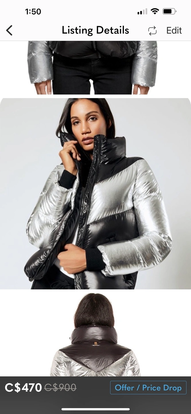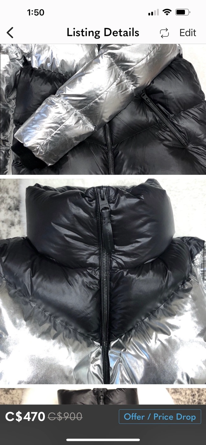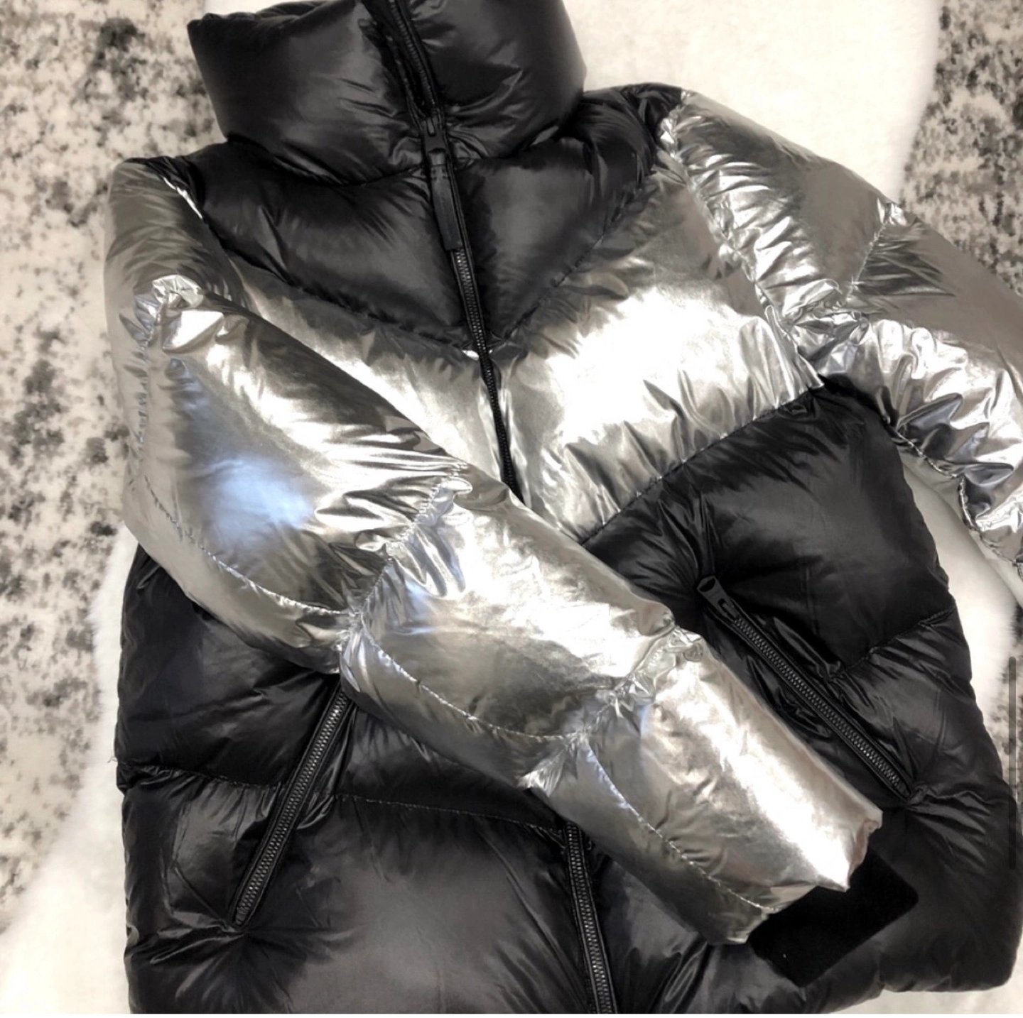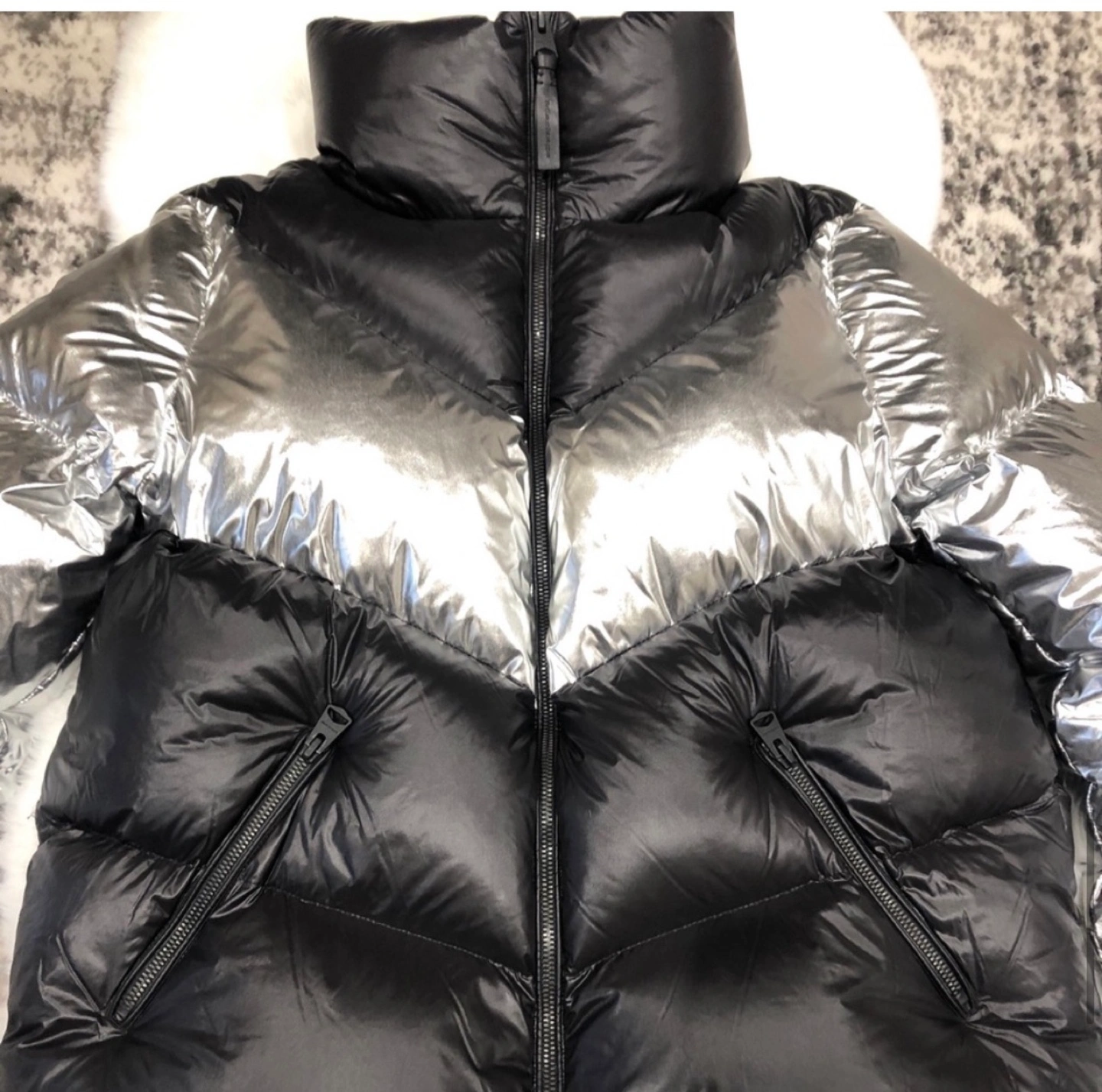 Stunning puffer jacket. Features a unique two-tone design with black and silver metallic panels. High collar, zipper closure. Like brand new/excellent condition. Worn literally once. Purchased for $800 plus tax. Size large.