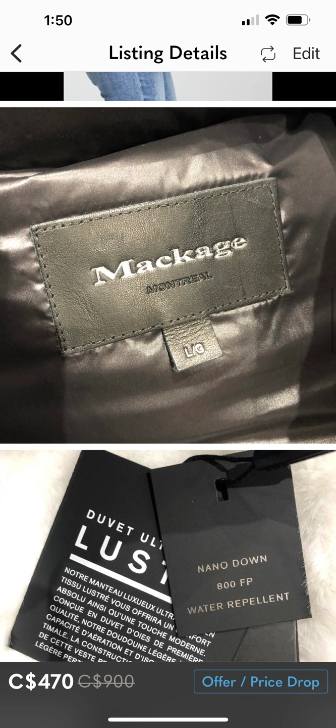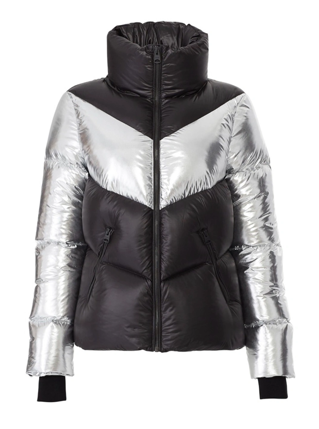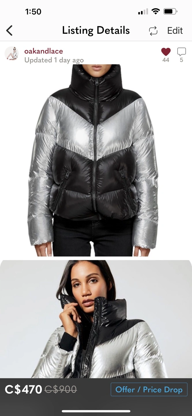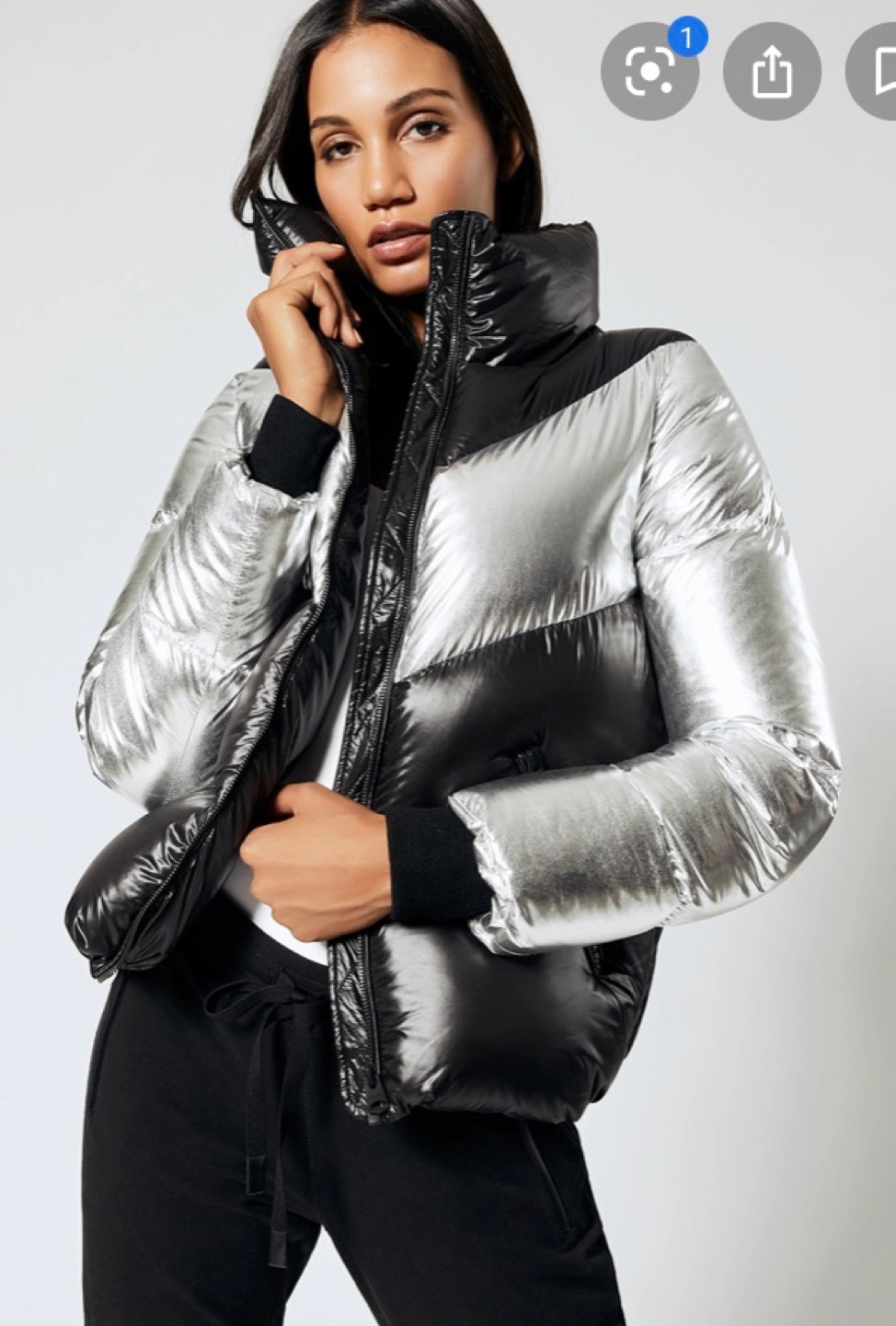 Stunning puffer jacket. Features a unique two-tone design with black and silver metallic panels. High collar, zipper closure. Like brand new/excellent condition. Worn literally once. Purchased for $800 plus tax. Size large.