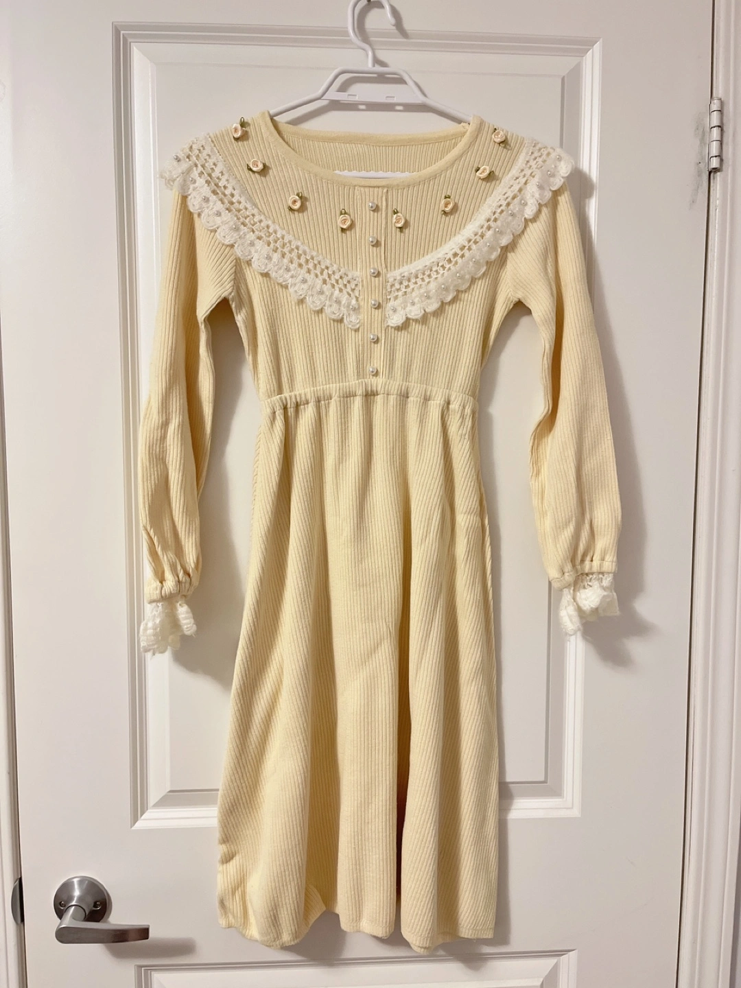 Long sleeve, ribbed knit midi dress. Pale yellow colour. Features a pretty lace neckline with small flower accents. Button detailing at the front. Elasticated waist.