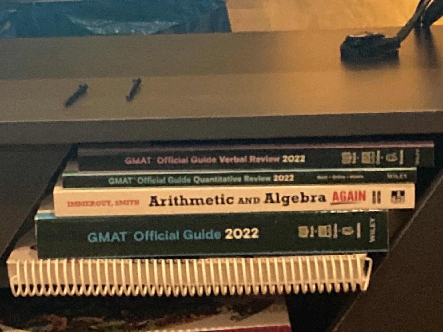 Set of GMAT prep books. Includes 2022 Official Guides (Verbal Review, Quantitative Review, and the main guide) plus Arithmetic and Algebra Again II. Good condition.