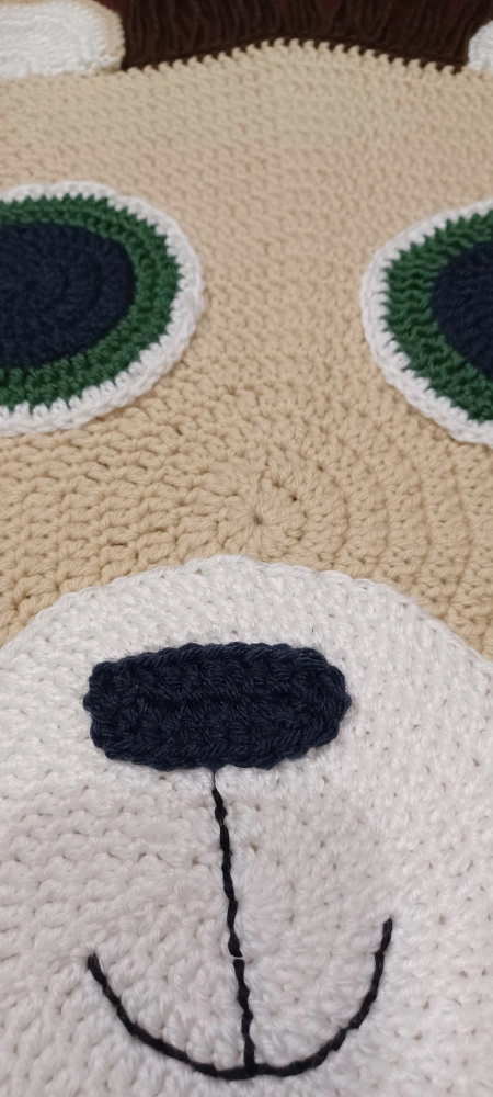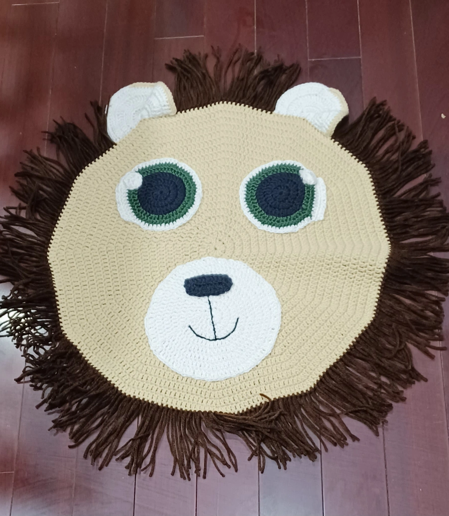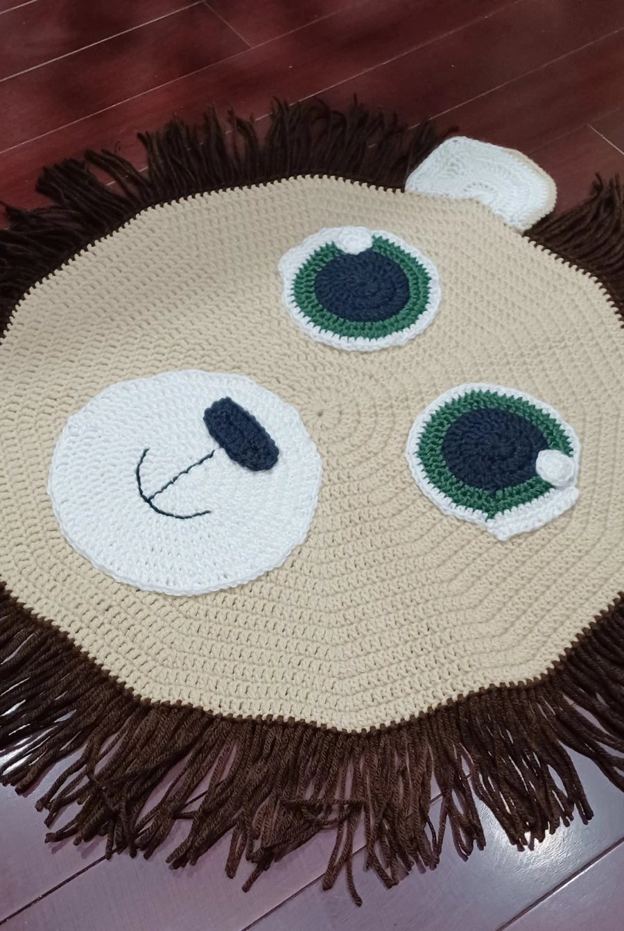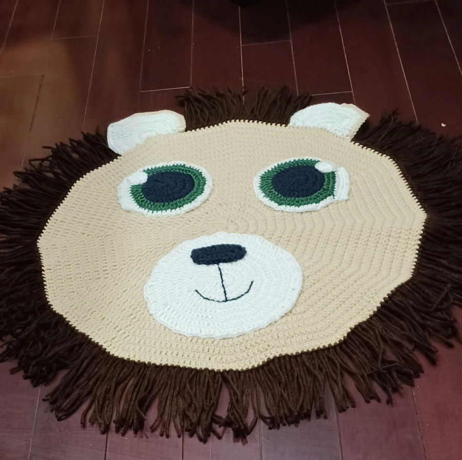 Adorable crochet lion rug. Perfect for a child's room. Features a friendly face and brown fringe. Unique and charming addition to any space.