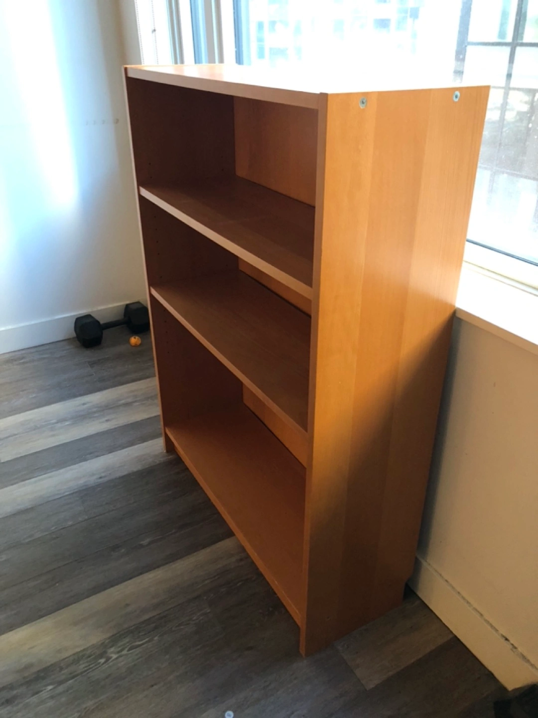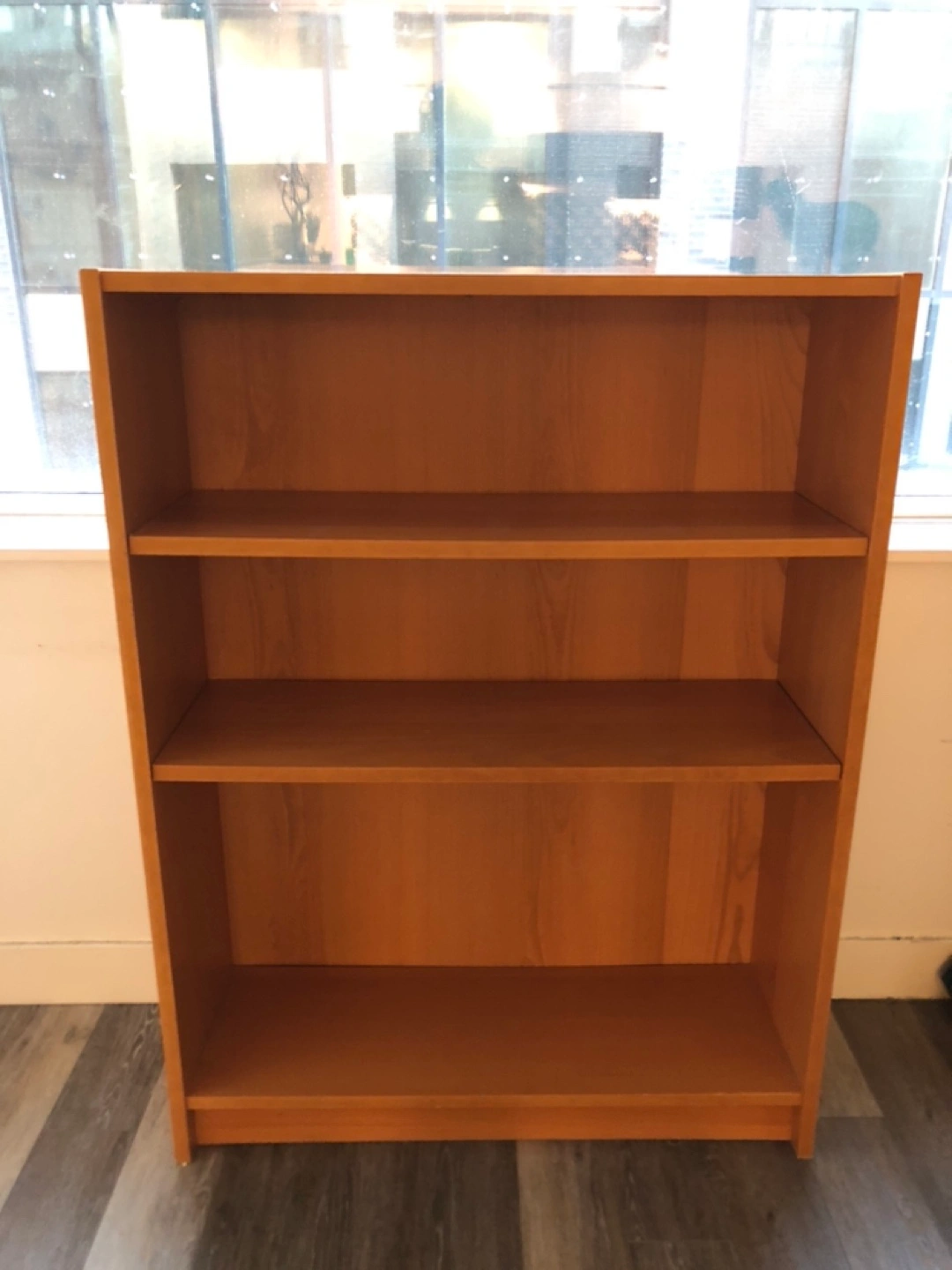 Light wood bookcase with three shelves. Good for organizing books or other items. Solid wood construction. Measures to approximately 31.5 by 11 by 42 inches