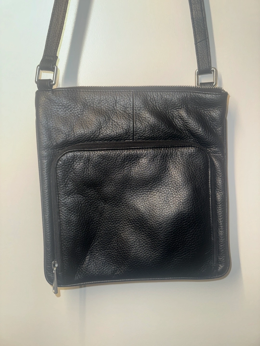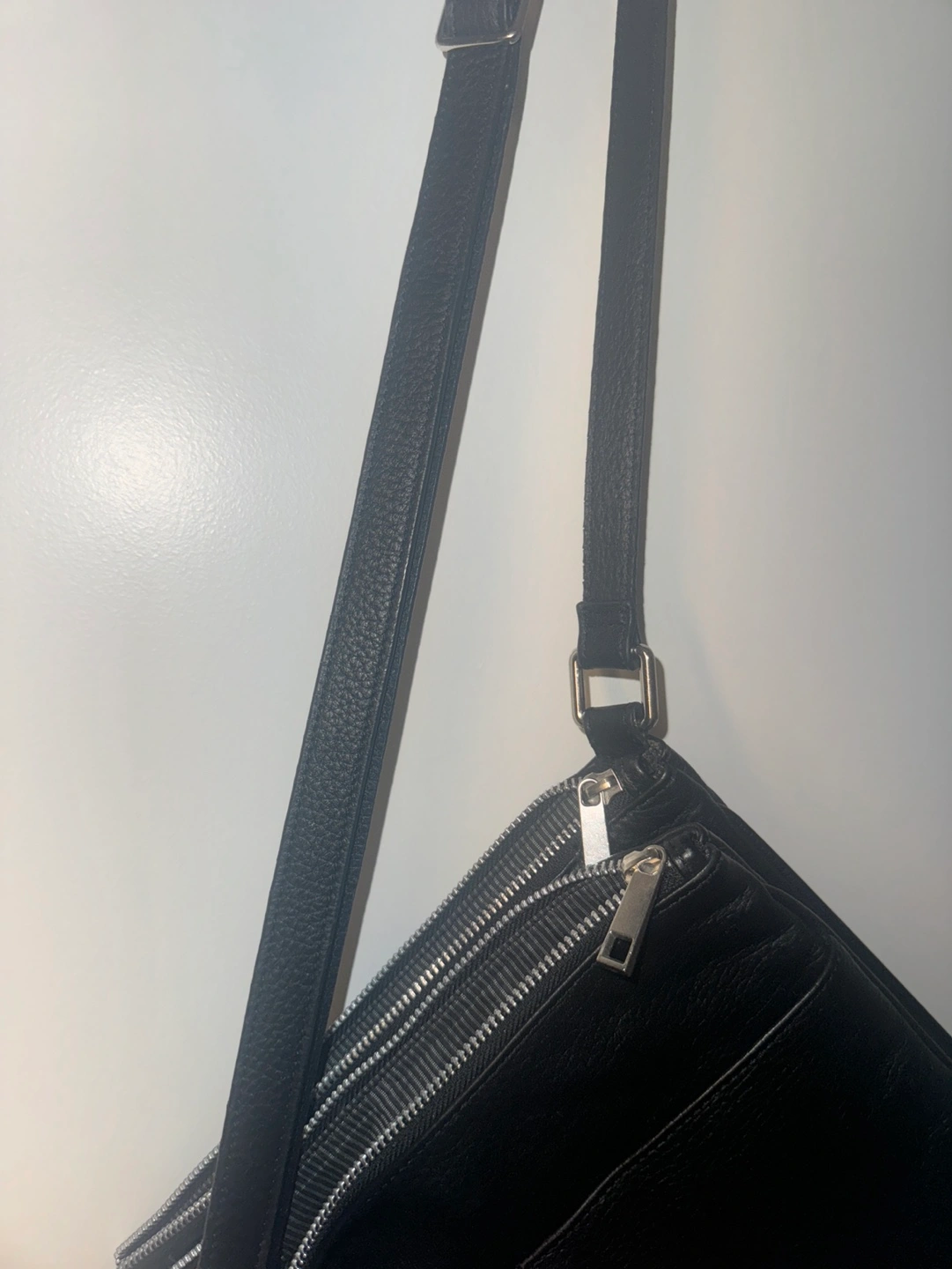 Small black leather crossbody bag. Features adjustable strap and zipper closure. Multiple compartments inside. Great for everyday use.