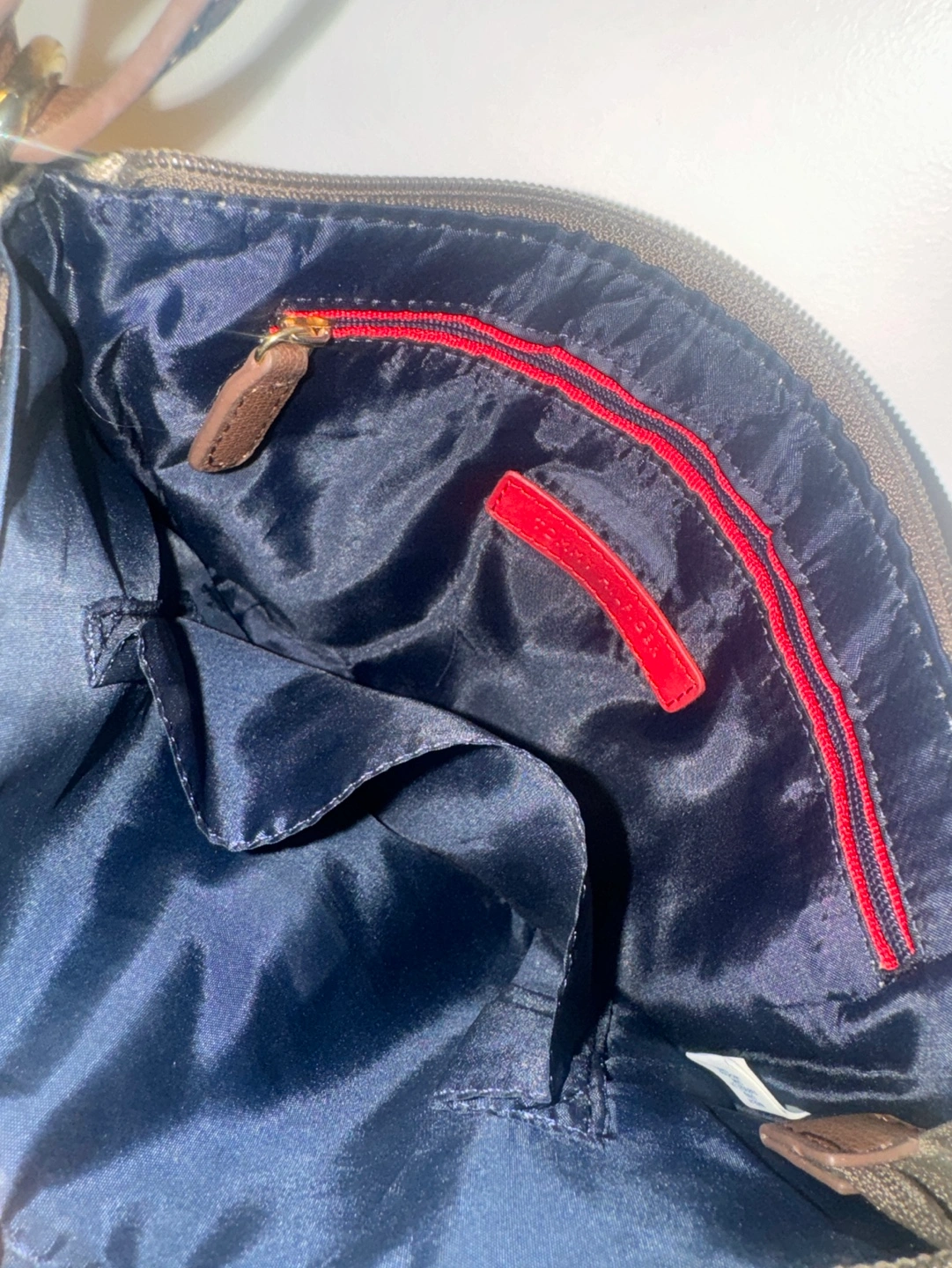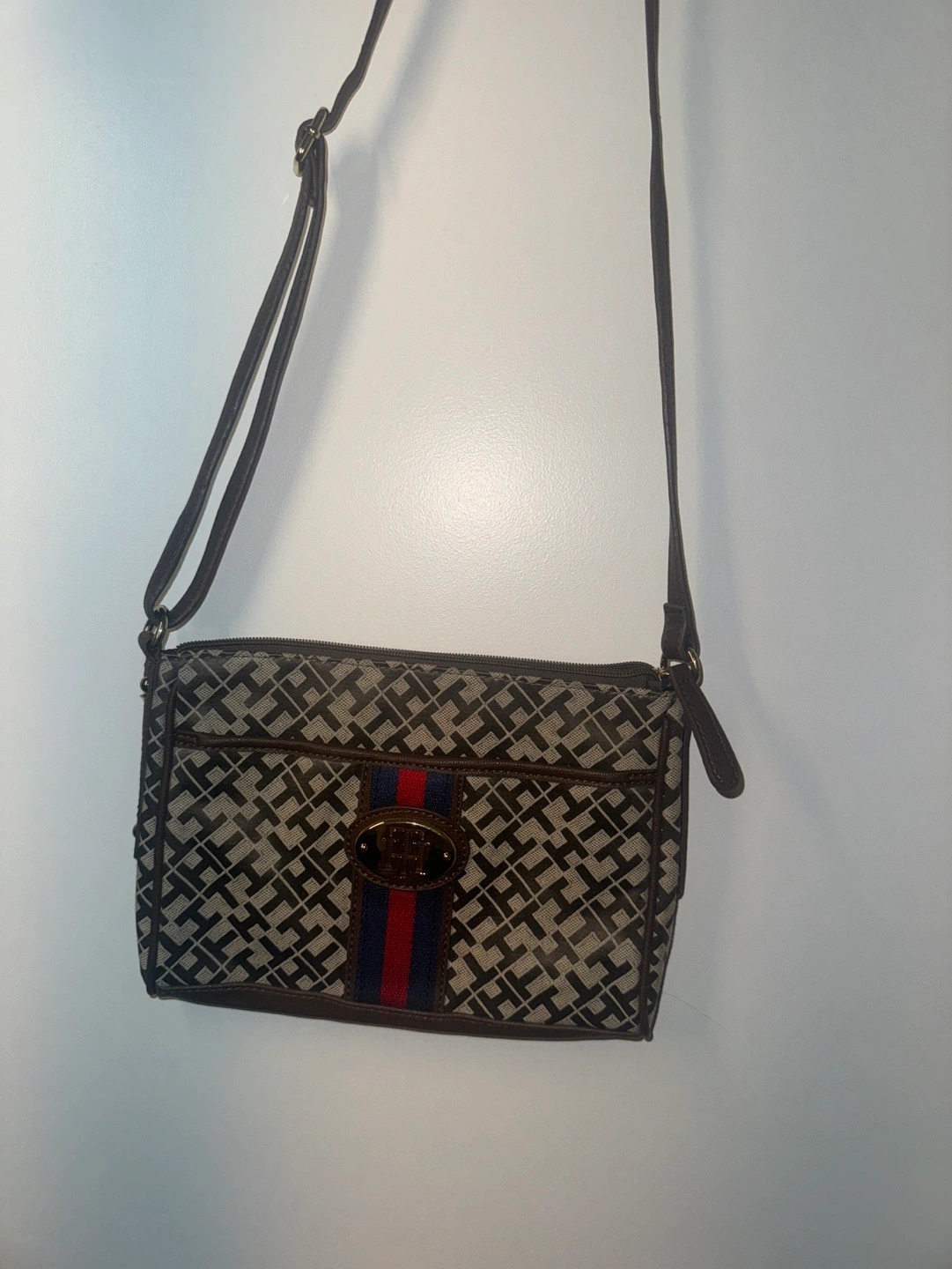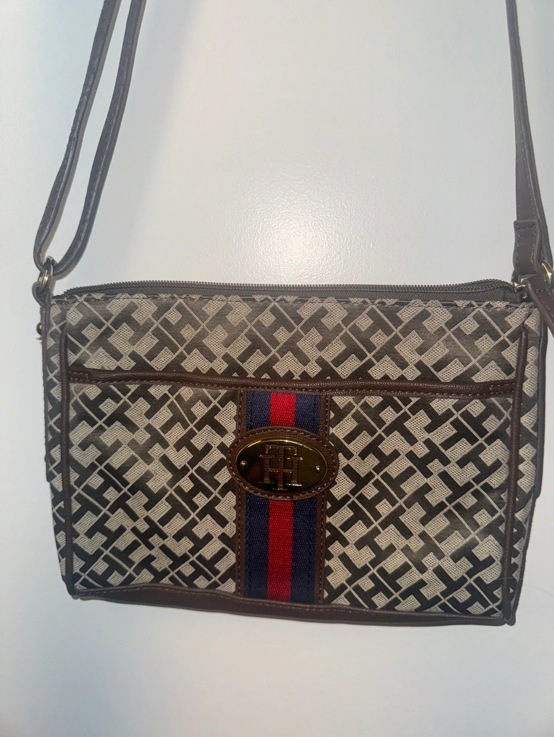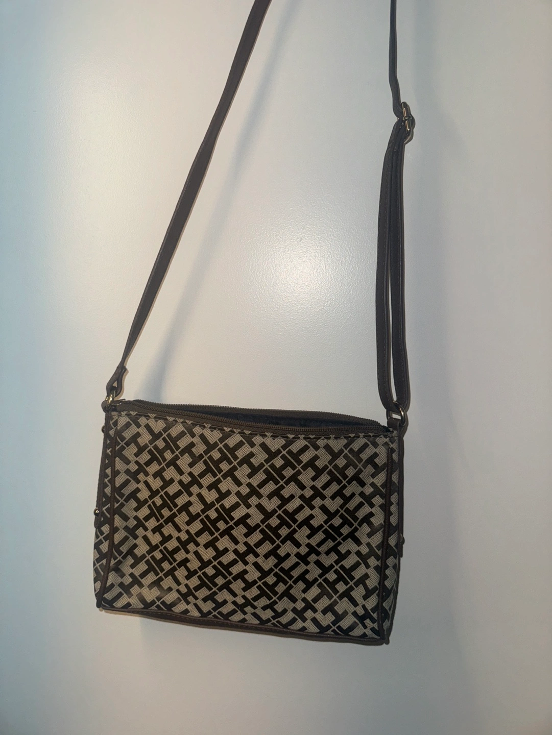 Brown and beige patterned crossbody bag. Features a zip closure and adjustable strap. Interior includes a zippered pocket. Excellent for everyday use.