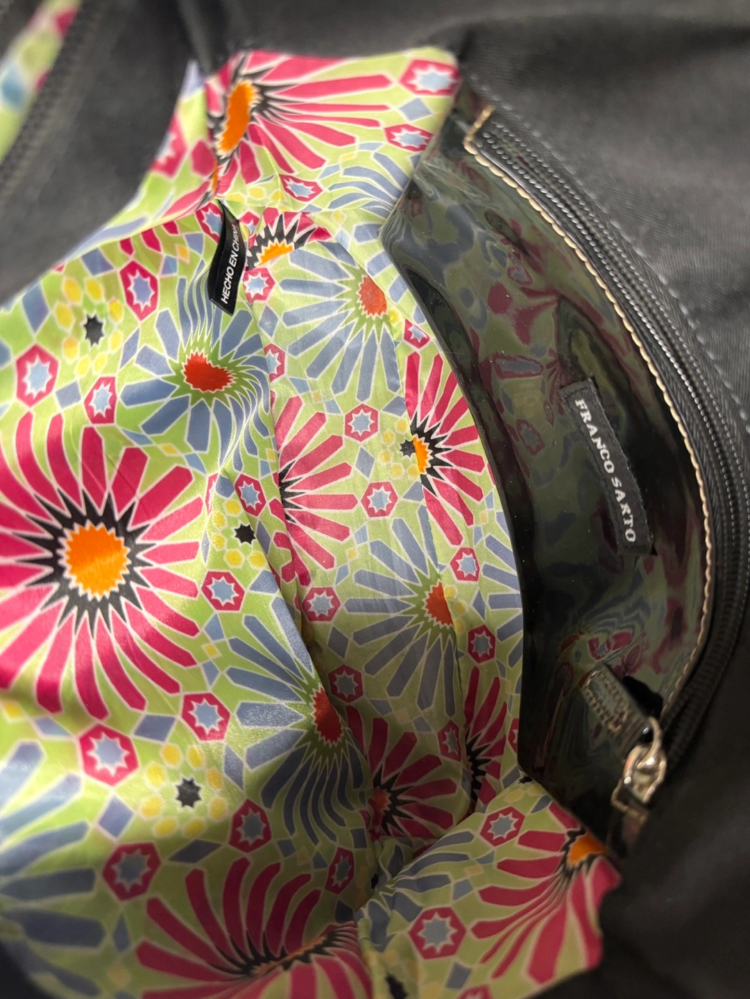 Small tote bag. Black canvas with beige accents. Two beige fabric handles. Interior features a patterned lining and small zip pocket. Great for everyday use.