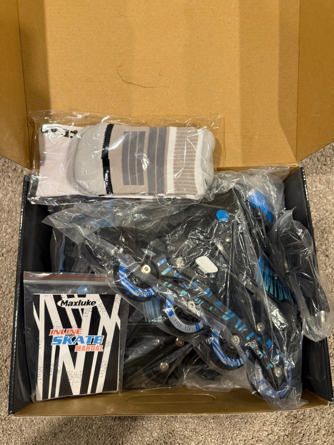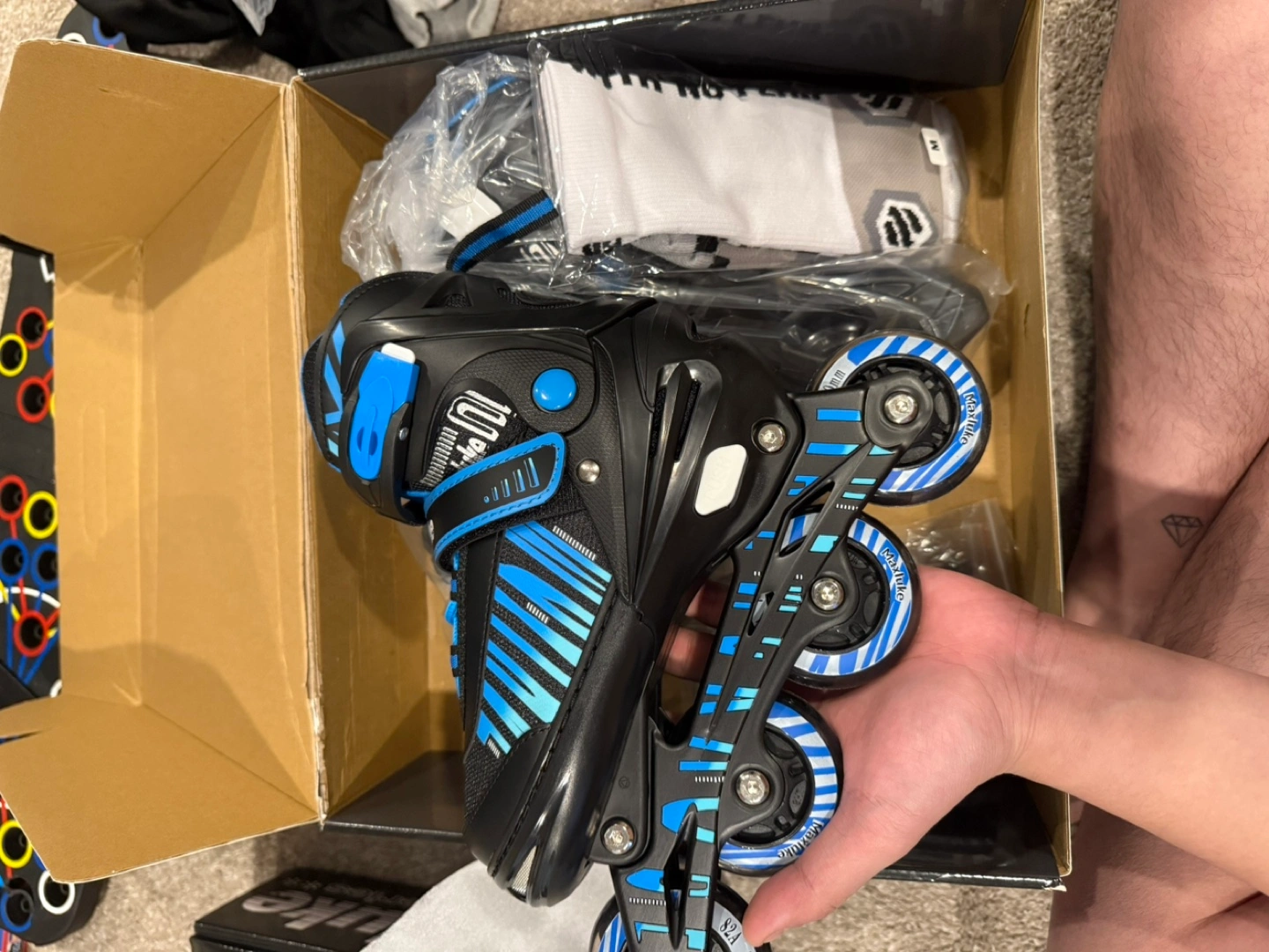 18Brand new inline skates, adjustable size. Includes skates, manual, and socks. Great for beginners. Blue and black colour scheme. 2 size M 1 size S