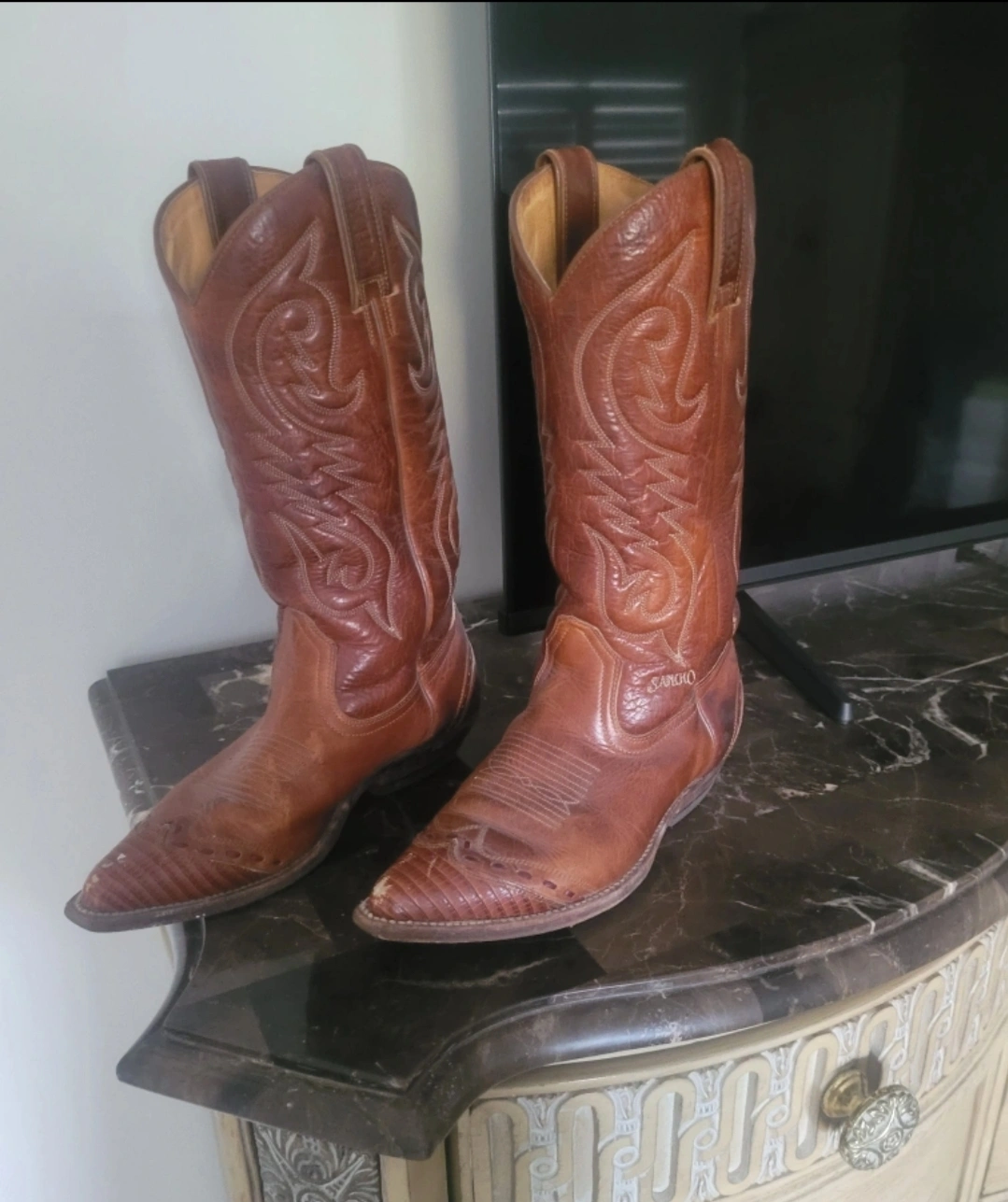 Sancho authentic Brown leather cowboy boots. Pointed toe with intricate stitching.