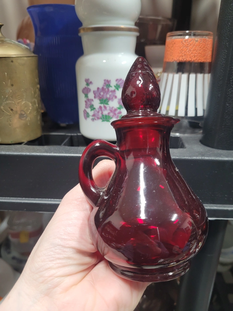 Small, vintage ruby red glass decanter bottle. for bubble bath or dish soap. Features a small handle and a unique strawberry stopper. Collectible item, great for fragrance lovers or vintage decor.