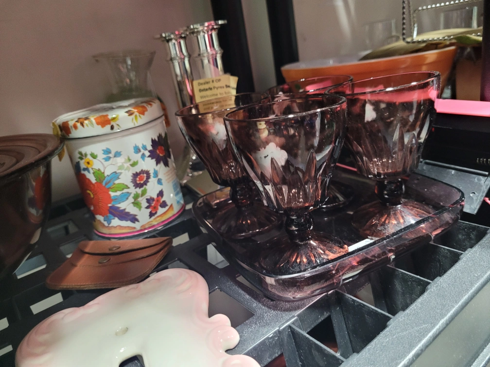 $59 for the 4 hazel atlas stemware with serving square plate. colour pattern is an amethyst purple.