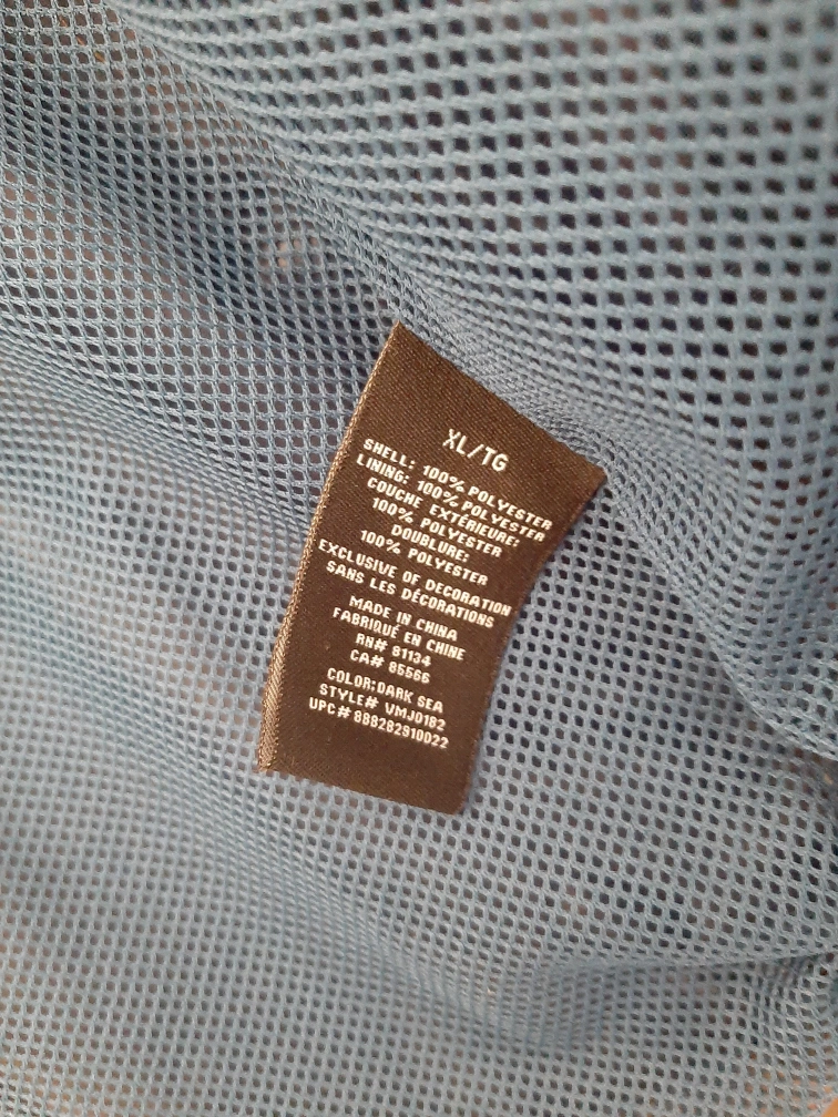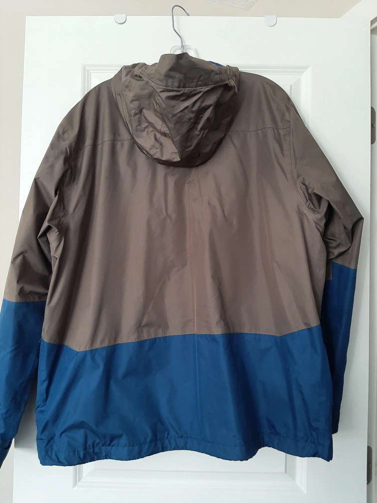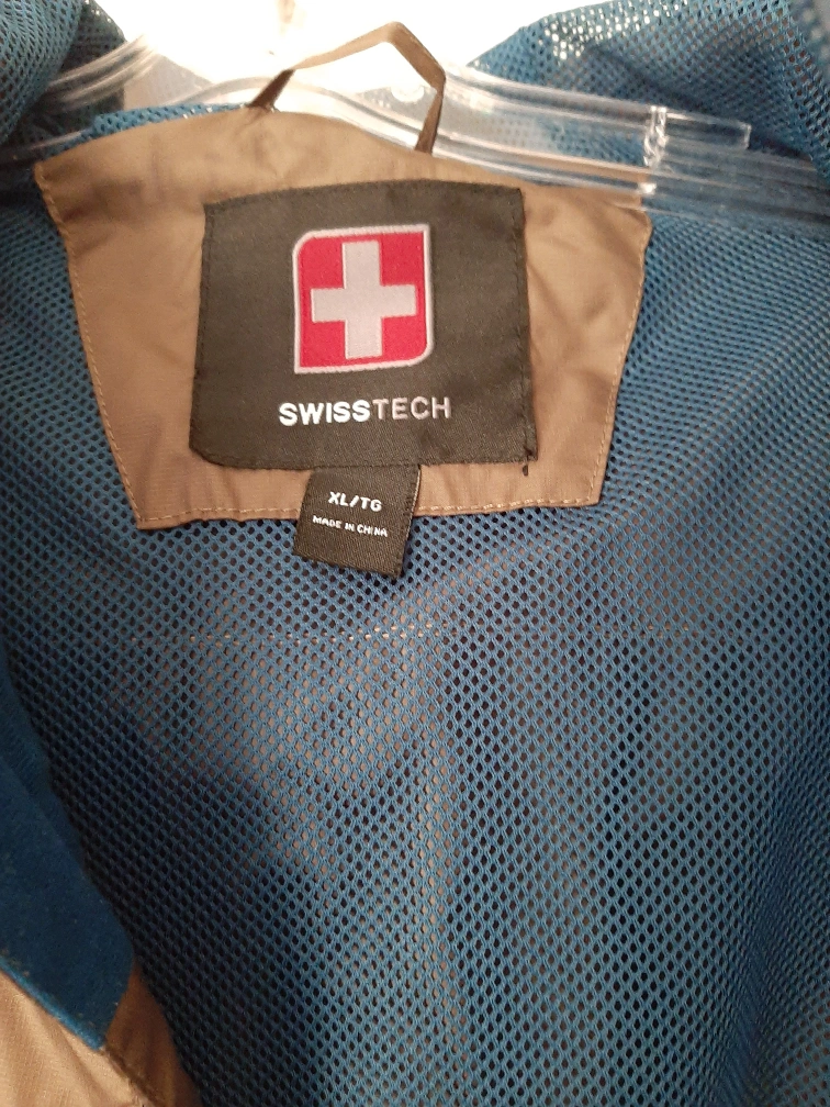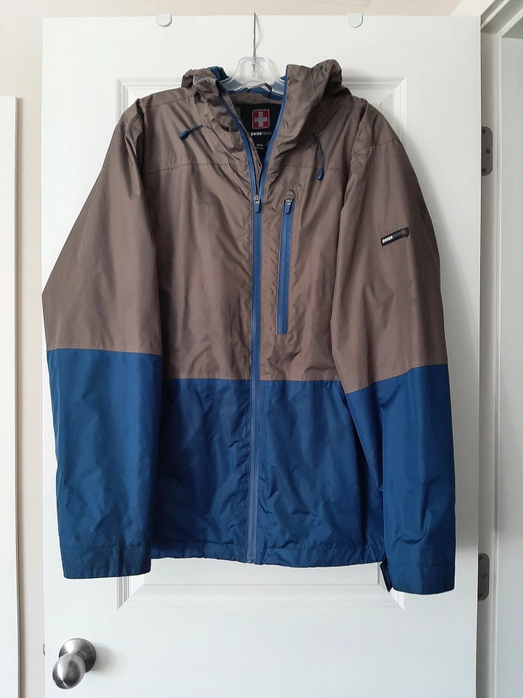 Men's SwissTech hooded jacket. Size XL. Two-tone colour scheme, dark brown/taupe top and teal bottom. Zipper closure. Pockets. Lightly insulated.