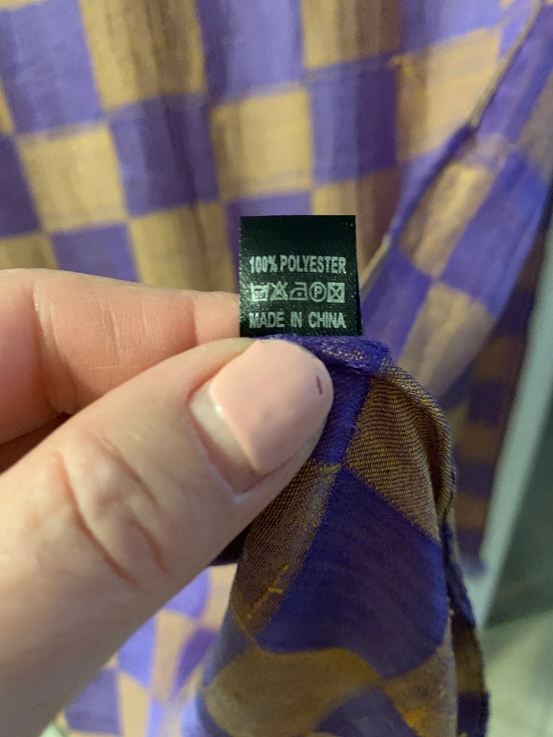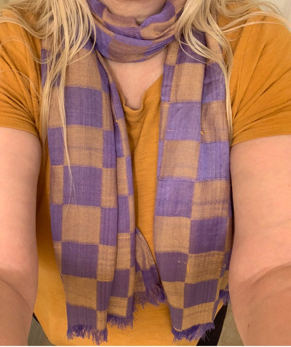 Stylish checkerboard pattern lightweight scarf in a purple and gold/taupe colour palette. It has a fringe detailing along the bottom and is 100% polyester. There are a few little snags that happen while wearing it but to be honest you can’t really notice them once it is styled on you. Scarves are always on trend and will be seen this spring and summer!