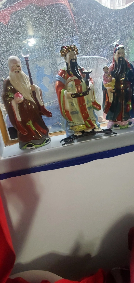 When displayed, the three wise men should be placed side by side in a row, with Fu on the left, Lu in the center, and Shou on the right. They can be placed on a table in the living room or dining area.