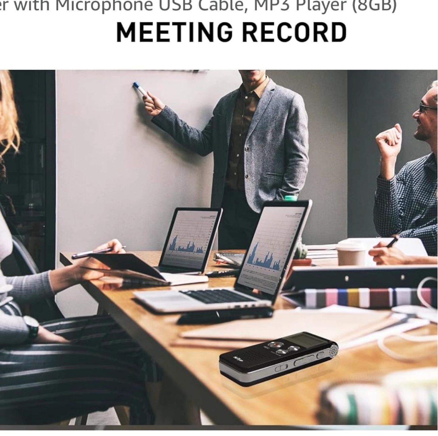 Portable digital voice recorder. Features an HD microphone, 8GB memory, and MP3 playback. Records up to 20 hours on a full charge. Includes USB cable. Supports MP3 and WAV formats. Voice activated recording.