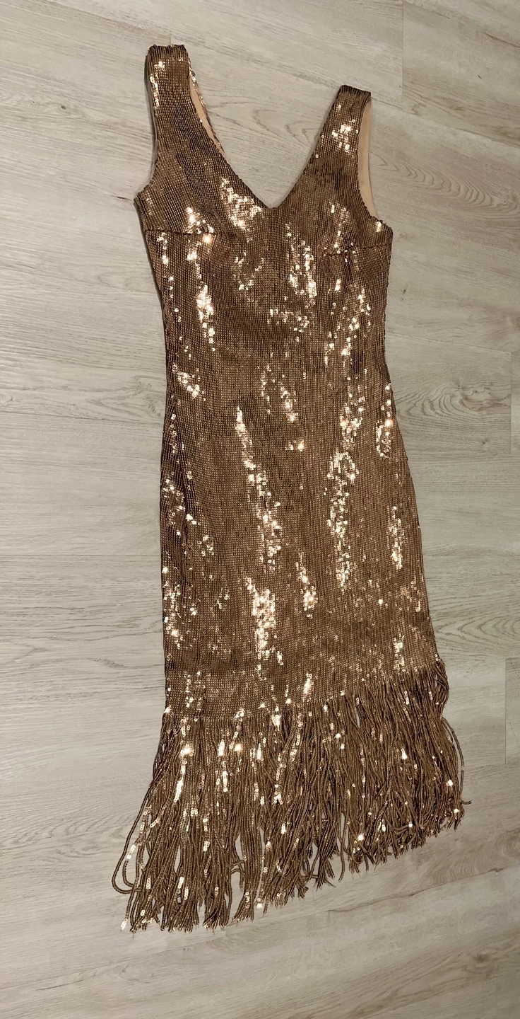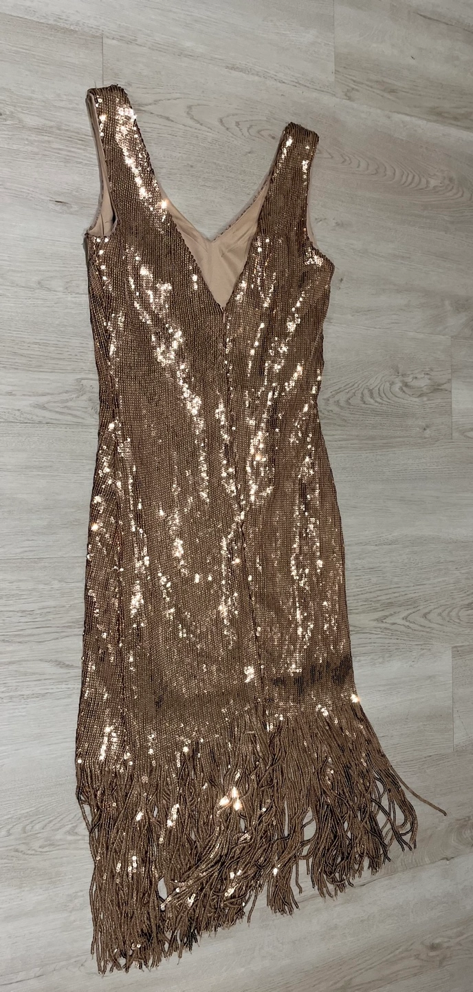 Stunning gold sequin mini dress. Features a V-neck, sleeveless design, and a beautiful fringe hem. Perfect for a special occasion.