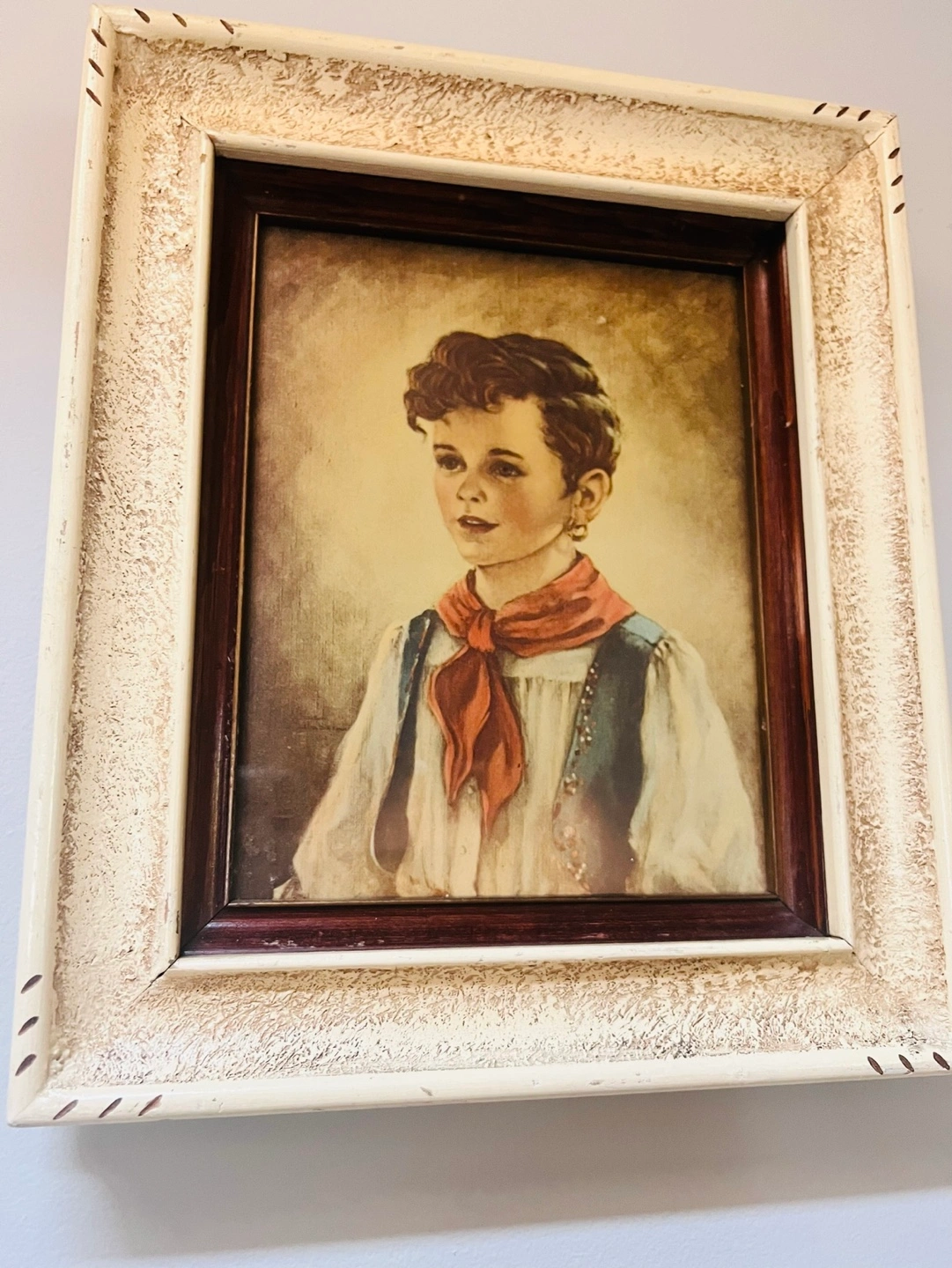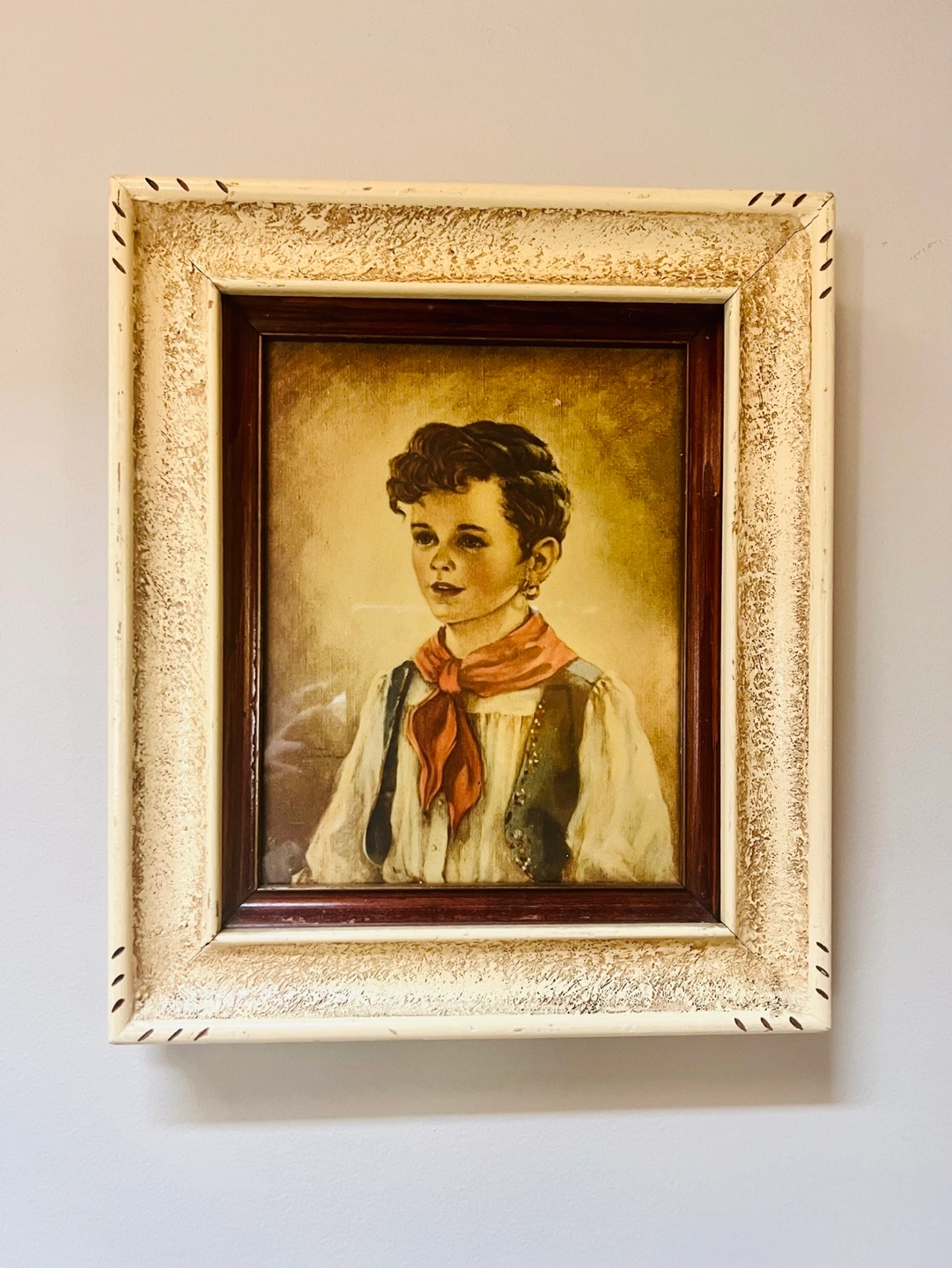 Cute vintage framed print. Features a portrait of a boy wearing a red neckerchief. Cream and brown frame. Shows some age.