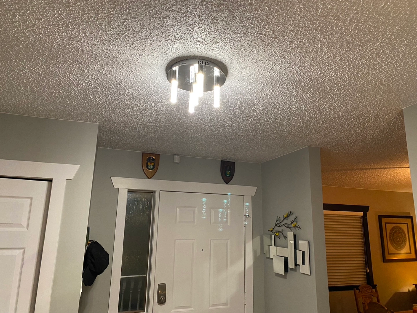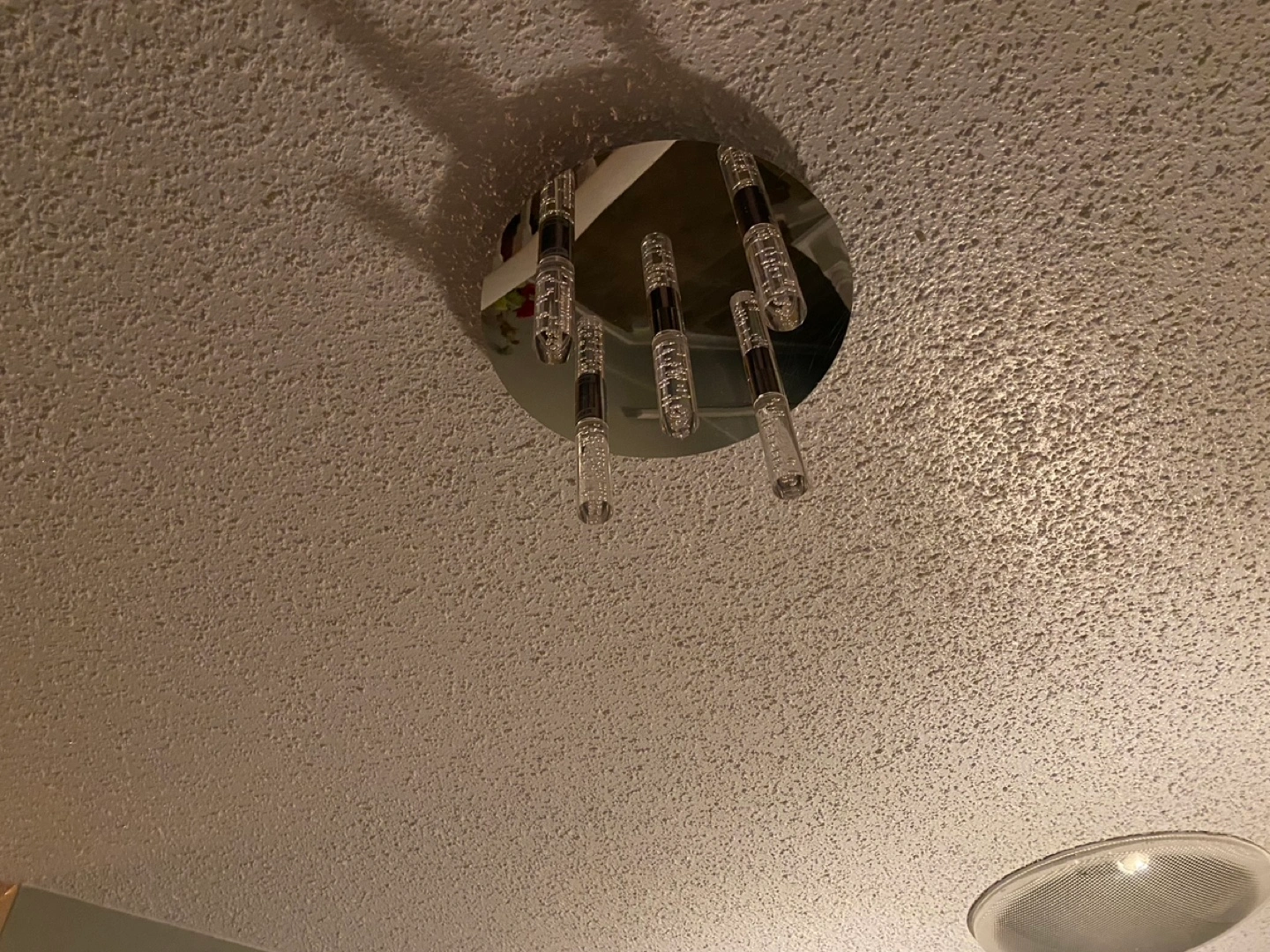Stylish chrome ceiling light. Four crystal-like rods. Round base. LED lighting. Great for hallways or smaller rooms.