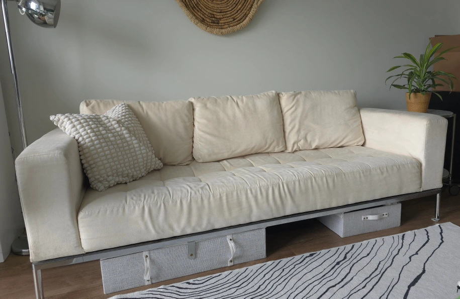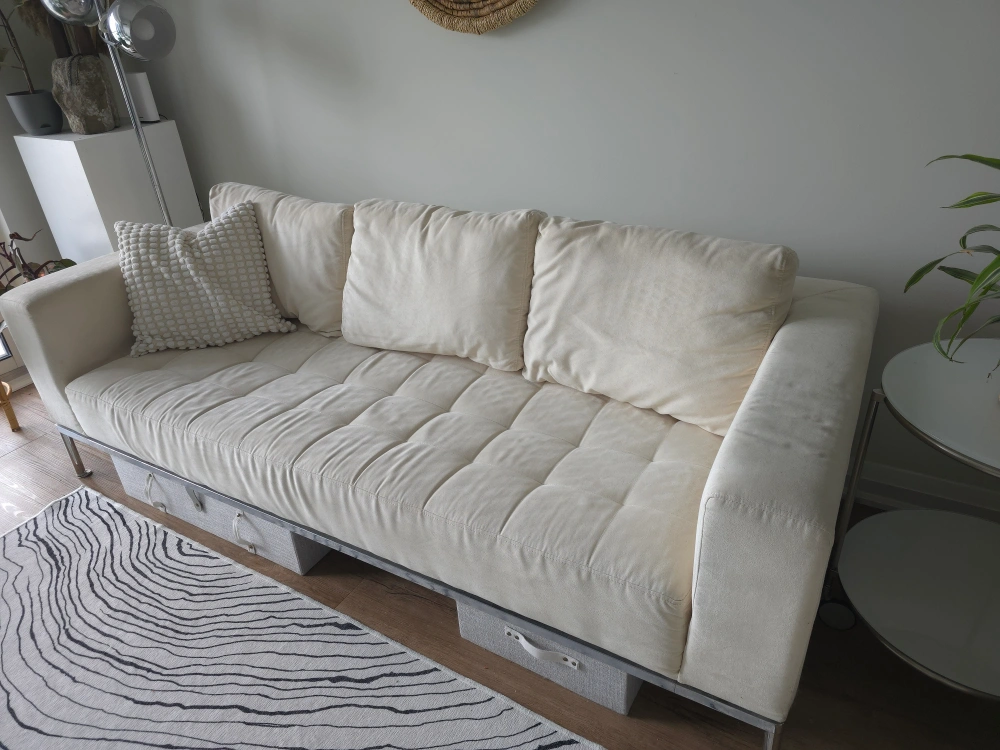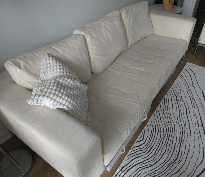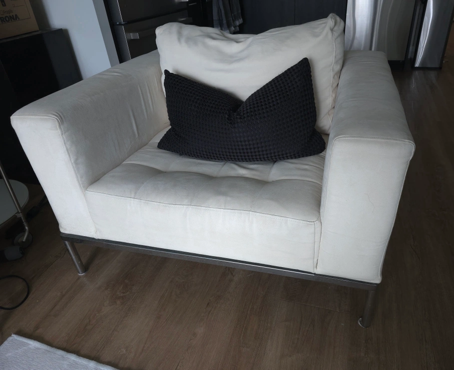 MOVING--MUST SELL! Modern cream color, microfiber fabric sofa (armchair-SOLD). Features tufting and sleek metal legs. Solid steel frame. Canadian made. Priced to sell quickly.