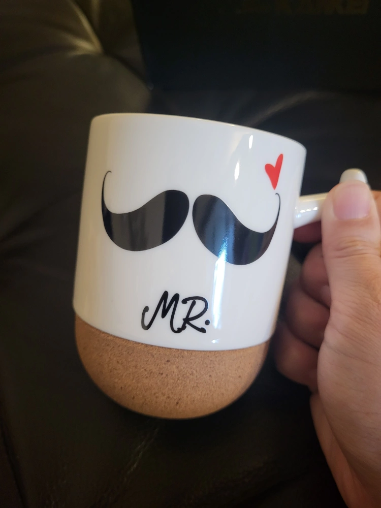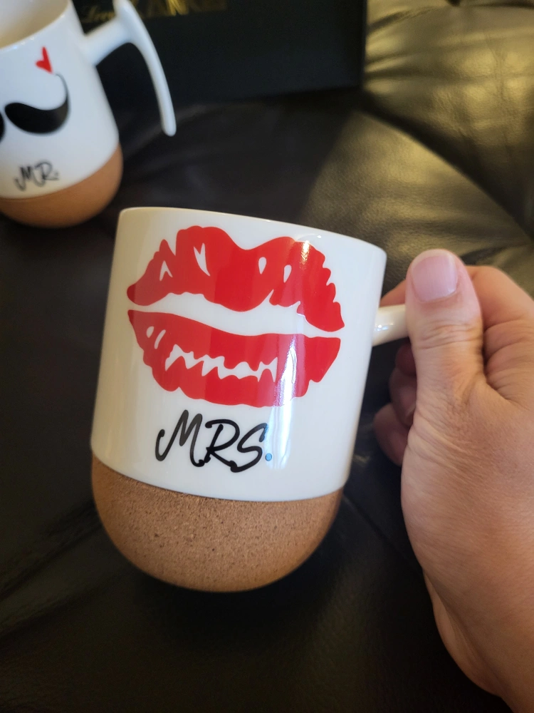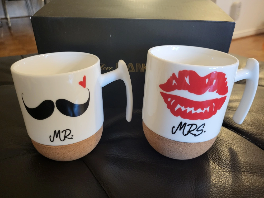 Set of two ceramic mugs. One features a moustache and 'MR.' The other has red lips and 'MRS.'. Cork bottoms. Cute design, perfect for couples.