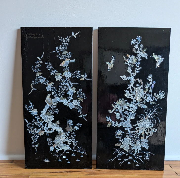 Beautiful pair of vintage Asian-style panels. Black lacquer background. Intricate mother of pearl inlay depicting flowering branches, birds, and butterflies. Adds elegance to any space.