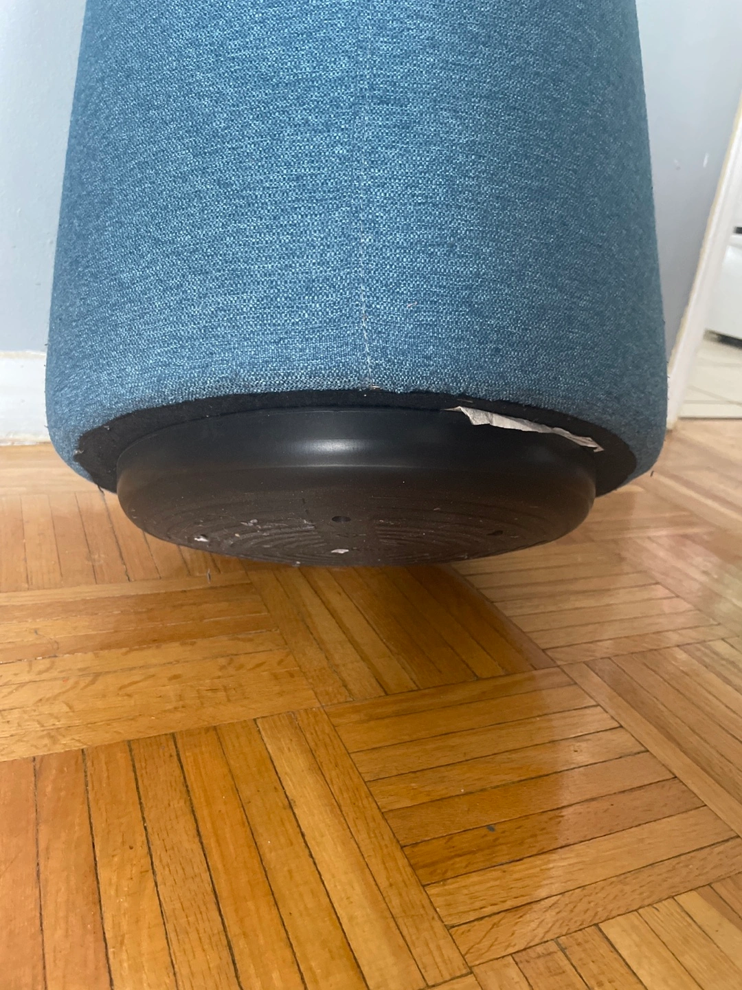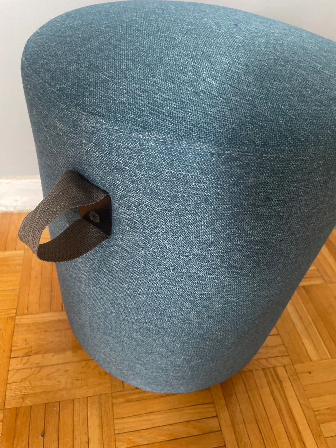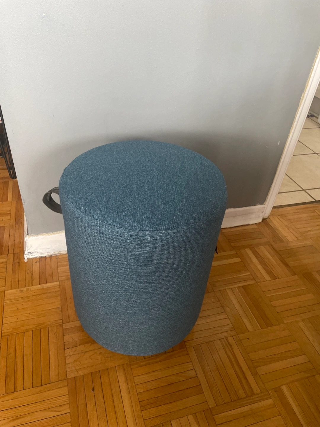 521Round blue fabric ottoman chair. Features a small handle. 19.5 inches No storage No pets /no smoking Need a new place to go