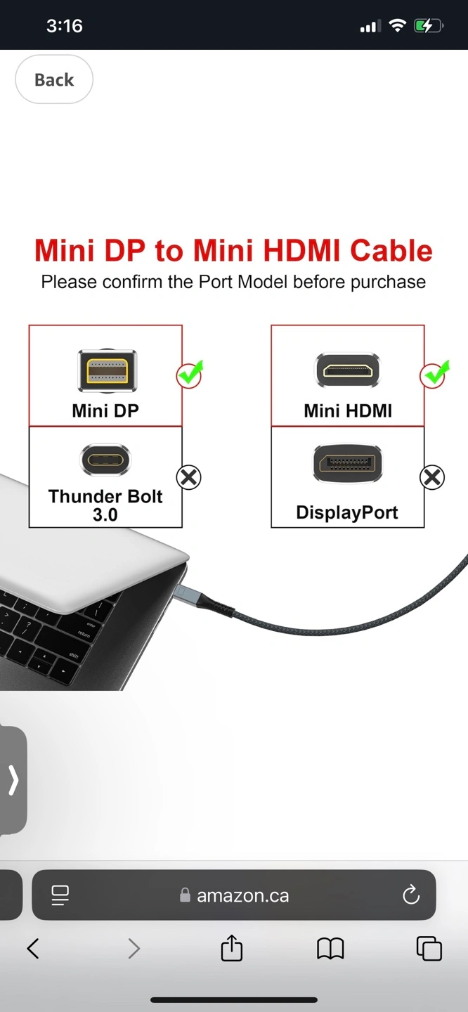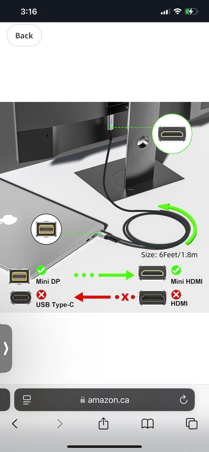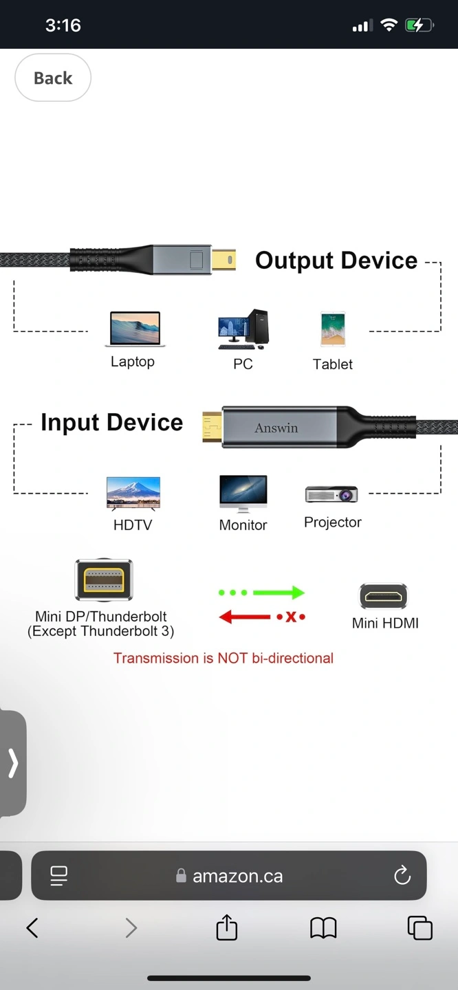 6-foot cable. Connects Mini DisplayPort (except Thunderbolt 3) to Mini HDMI. Compatible with laptops, PCs, tablets, HDTVs, monitors, and projectors. Mirror or extended mode. Transmission is not bi-directional.