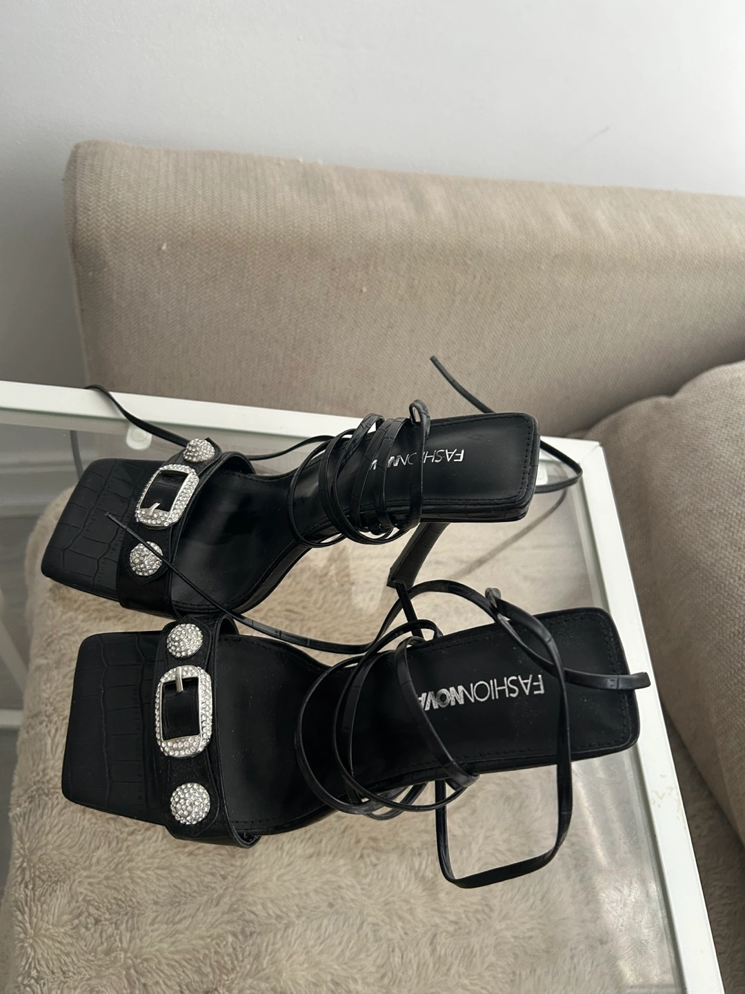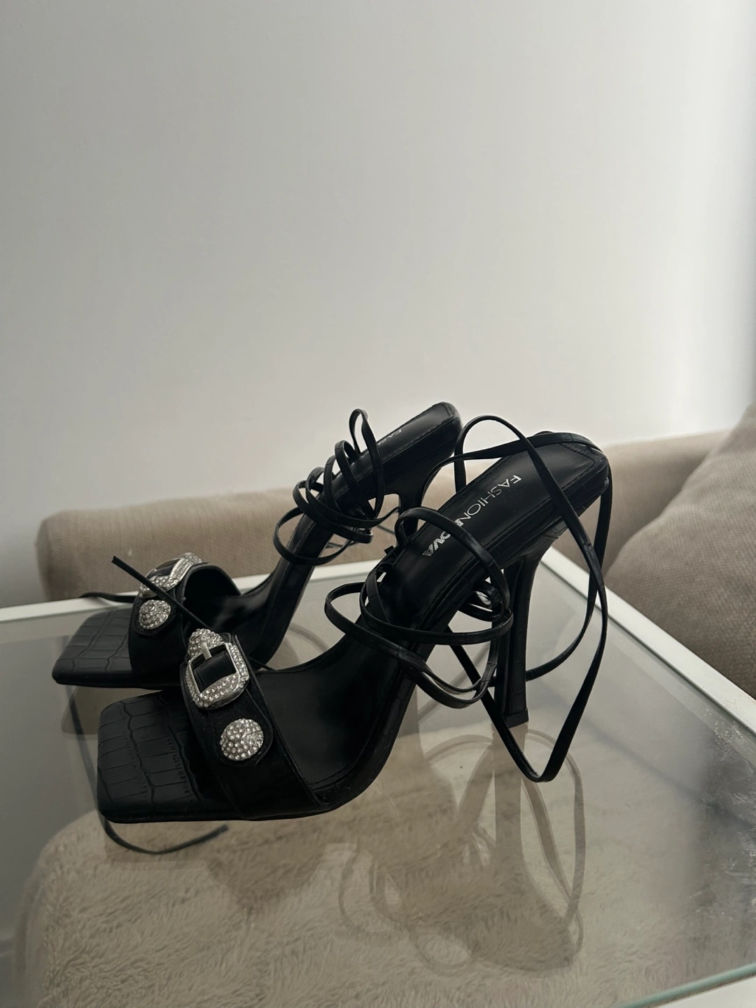 Stylish black high heels. Features lace-up detailing and rhinestone buckle accents. Square toe and stiletto heel. Elegant and eye-catching.