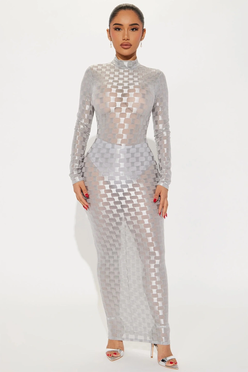 Fashion Nova Stunning silver maxi dress. Features a high neck and long sleeves. Mesh fabric with a checkered pattern.