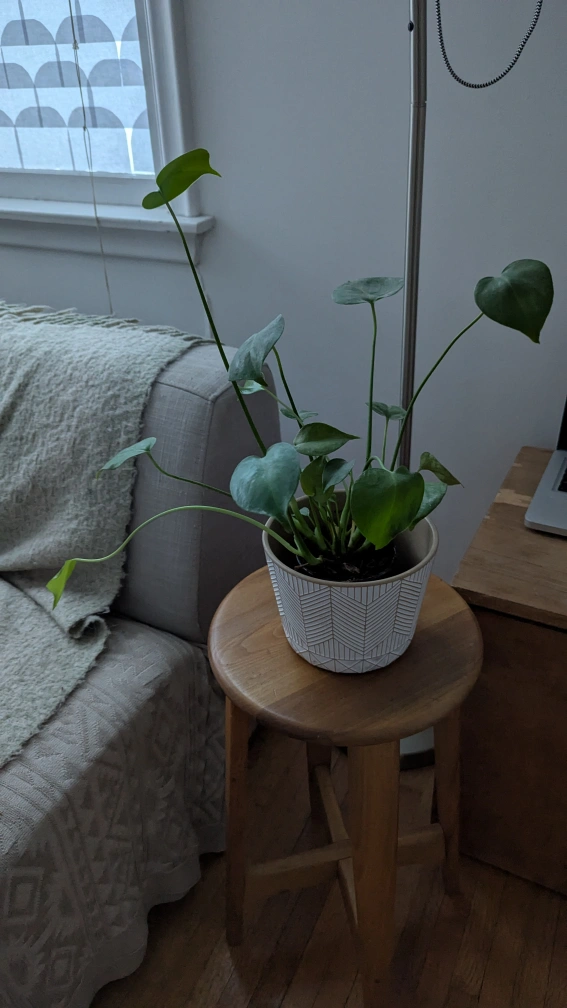 Small monstera in search of new home. Our place just doesn't have enough light to keep it happy. No known pests, just a little leggy from not enough sunlight. Will come in green nursery pot, white cover pot not included. Pick-up only