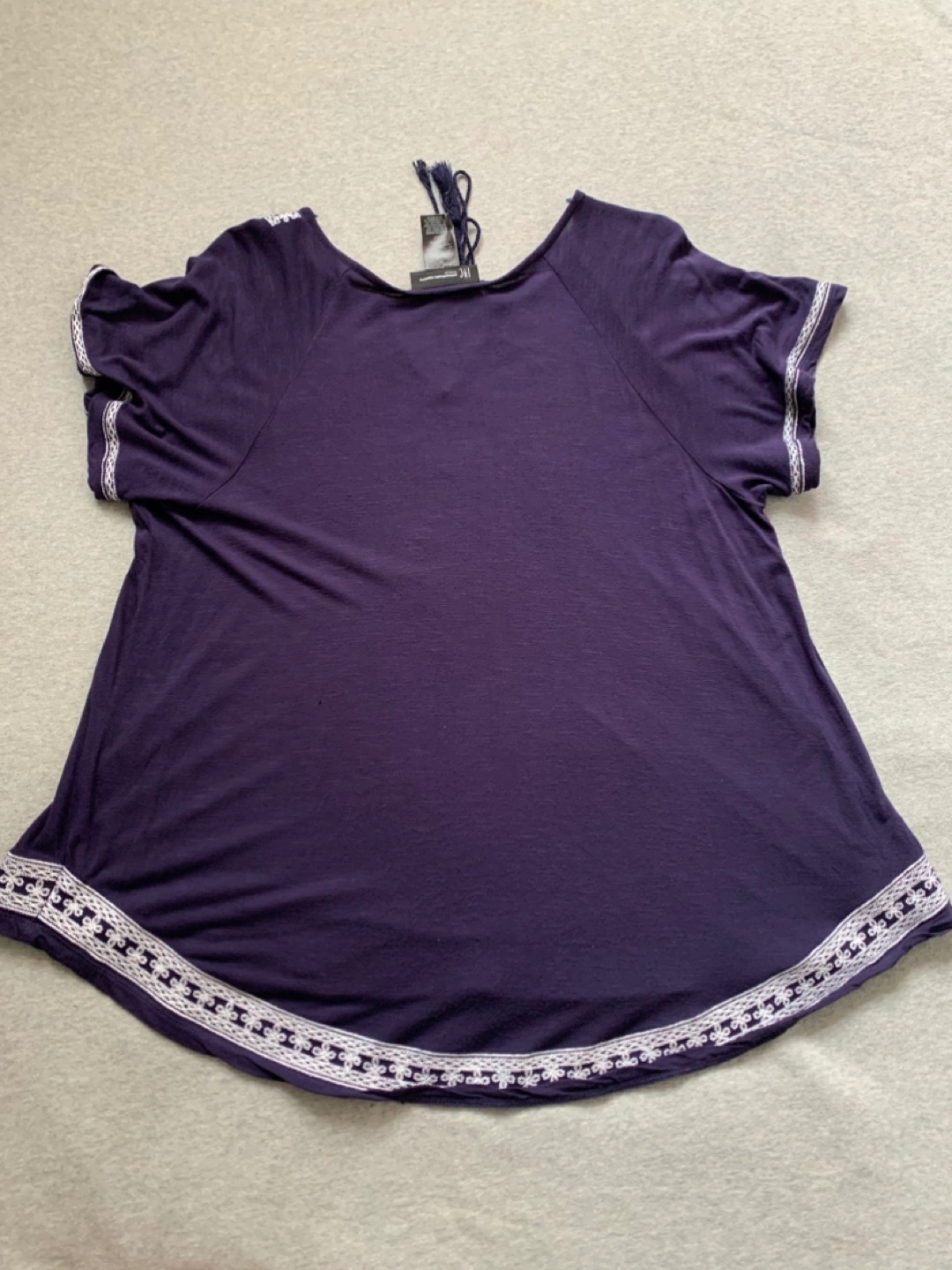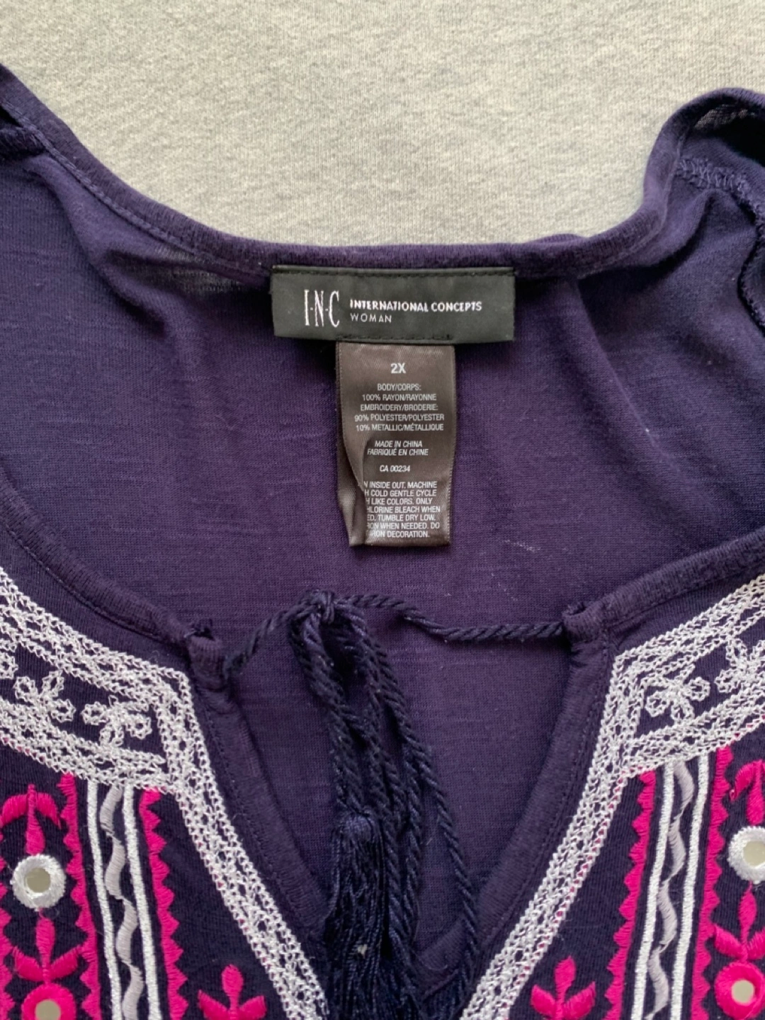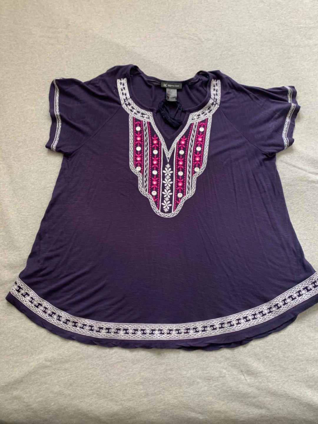 Short sleeves. Embroidered details. A-line shape. Tassel detail at neckline. SUPER soft textile. Note: there is a small hole in fabric on rear left side. Priced accordingly.
