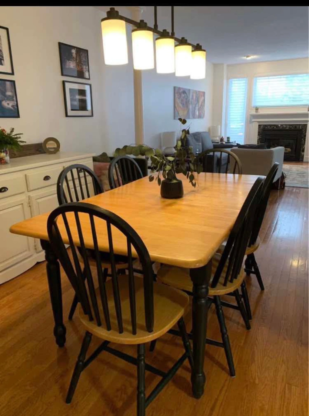 105Wooden dining table with six matching chairs. Tabletop is light wood, chairs are painted black. Classic design, great for smaller spaces.