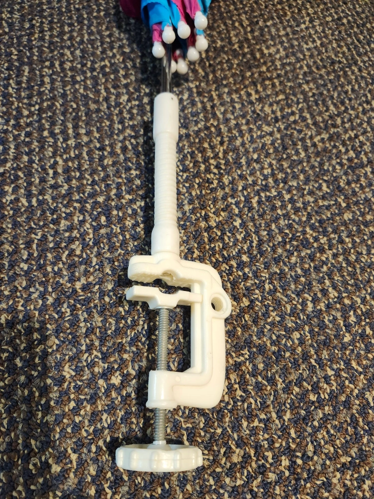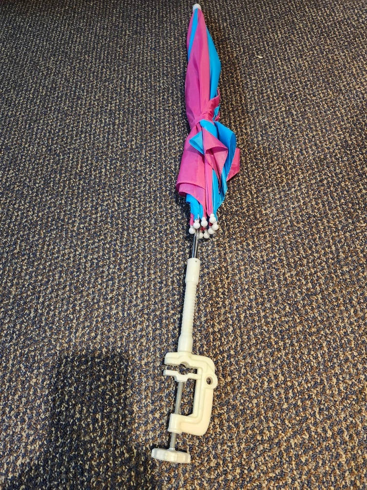 22Portable patio umbrella. Pink and blue striped canopy. White plastic clamp. Great for small spaces.$10.00