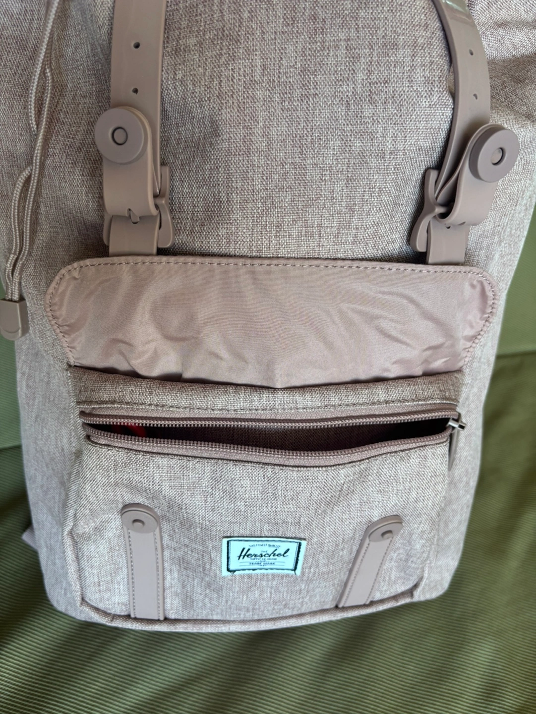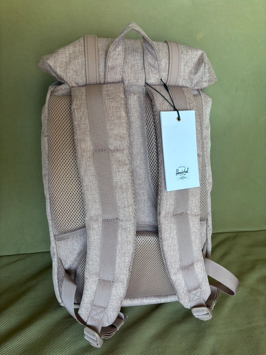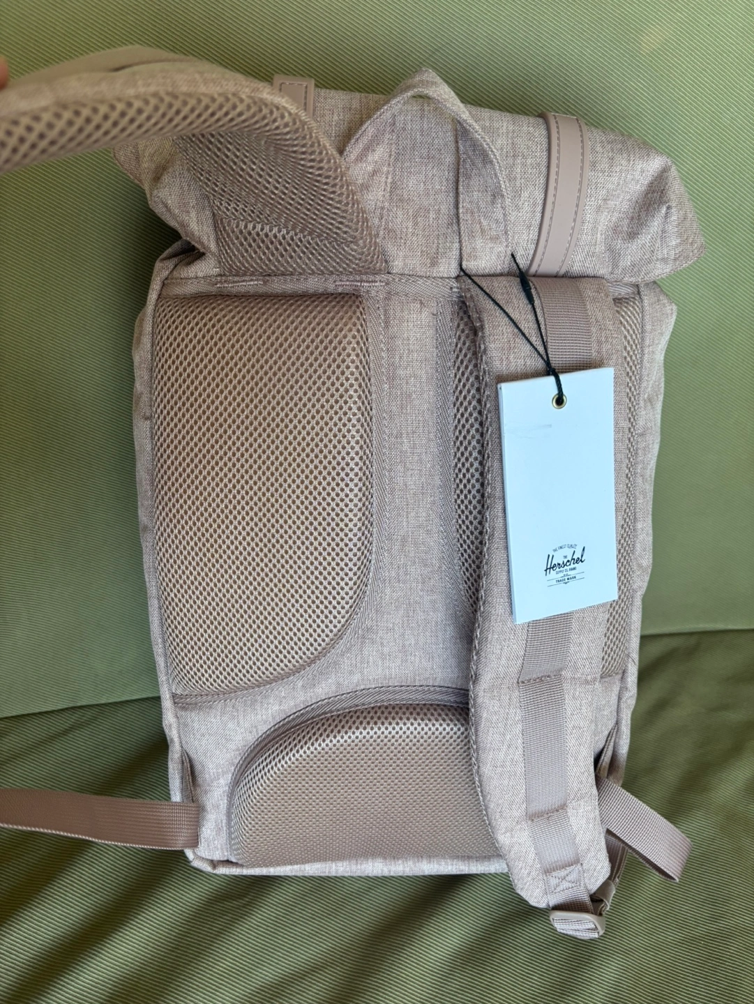 Stylish and functional backpack. Features adjustable straps, multiple compartments, and a drawstring closure. Padded and fleece lined 13” laptop sleeve. Contoured shoulder strap, air mesh back padding. Perfect for everyday use or travel. Ash rose crosshatch color. Original $ 183 + tax.