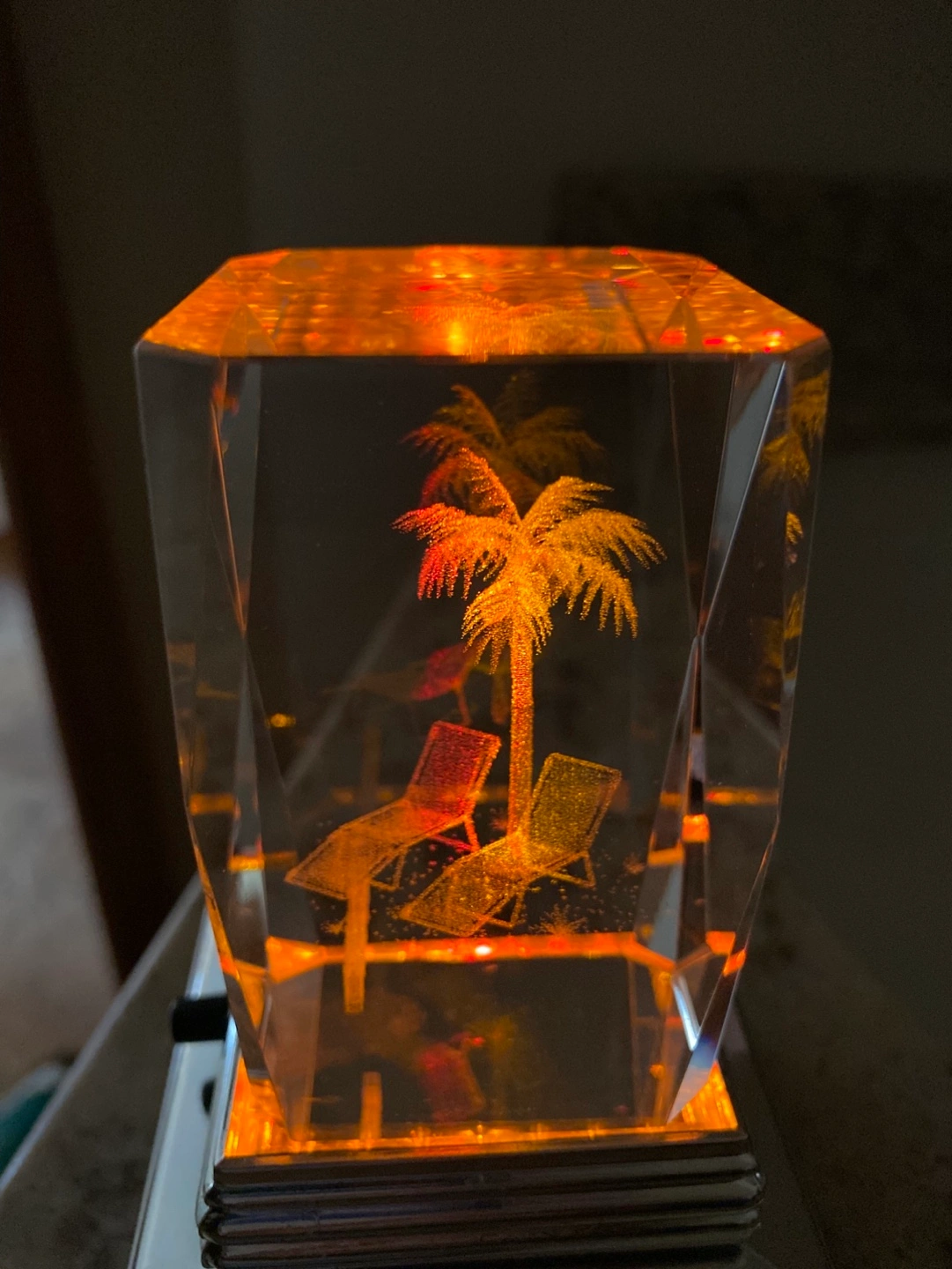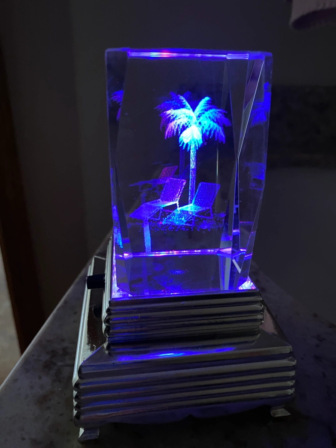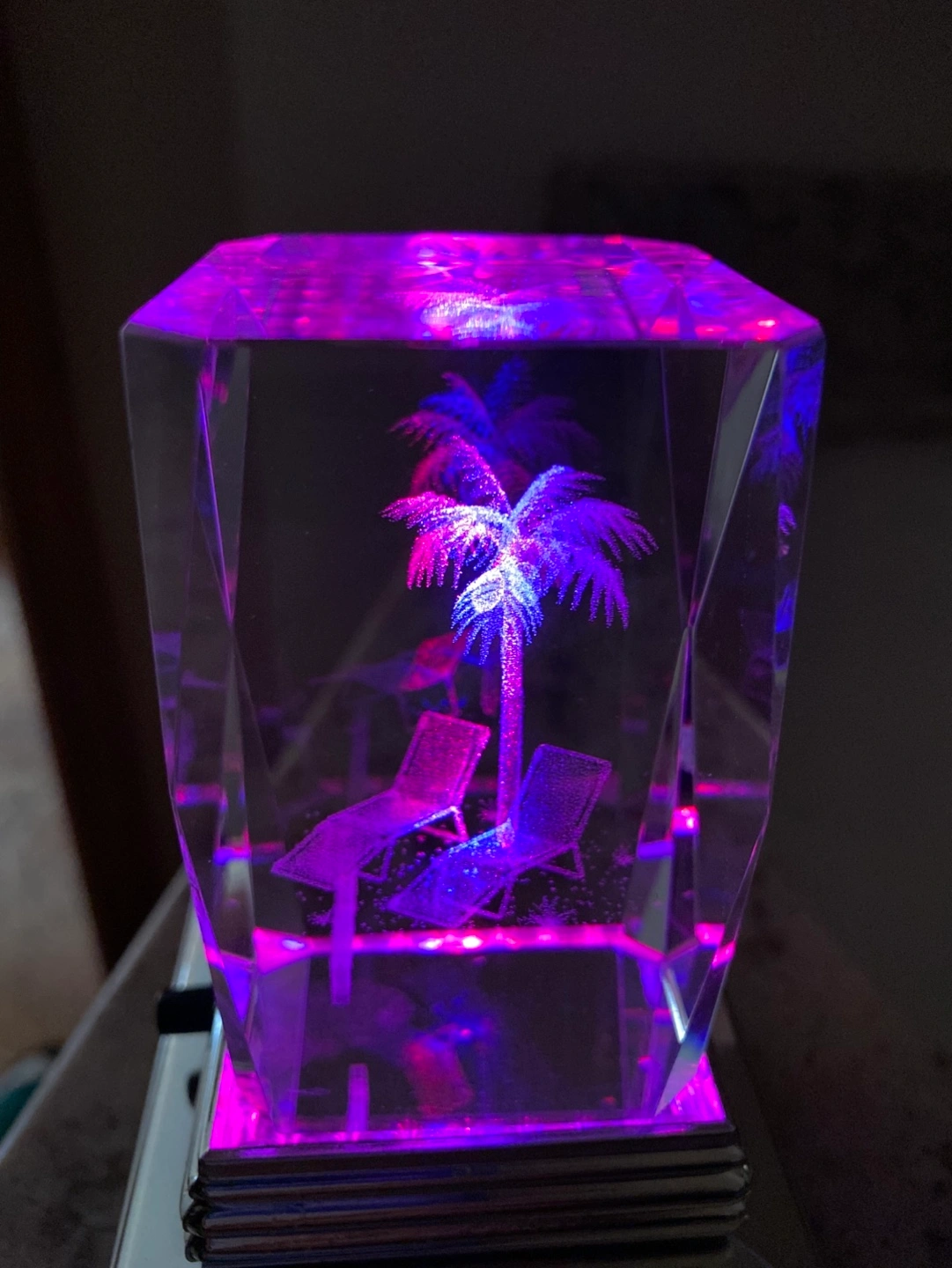 Laser-etched 3D hologram crystal cube Features a palm tree and lounge chairs. Includes a light-up base. No smoking or pet household. Pick up in Scenic Acres NW